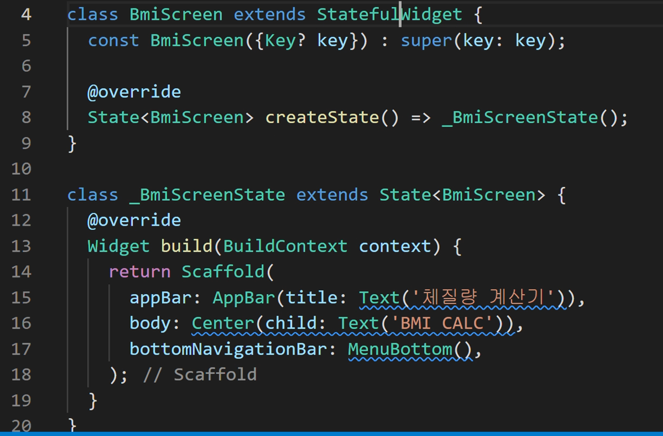 체질량 계산기 화면인 bmi_screen.dart는 현재 아래와 같이 Stateless위젯입니다.