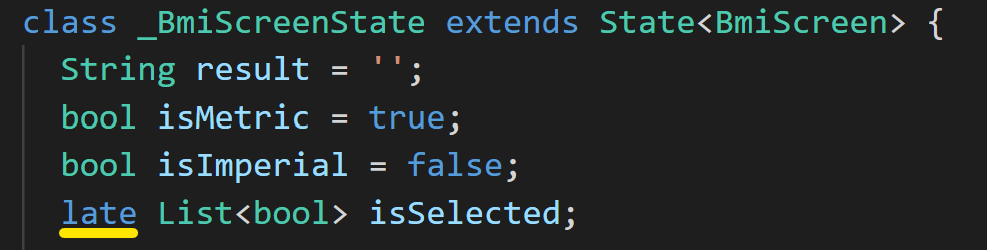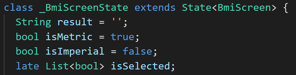 result는 체질량 계산 결과값을 담을 변수입니다. isMetric 과 isImperial은 bmi계산시에 미터법과 파운드법의 선택 여부를 담을 부울 값입니다. 미터법을 기본으로 할것이므로 isMetric에 true로 주었습니다. isSelected는 isMetric과 isImperial 담을 리스트이며 ToggleButtons의 위젯의 isSelected 인수에 할당할 것이며 ToggleButtons위젯의 토글 선택 여부(상태)를 담당하게 됩니다.