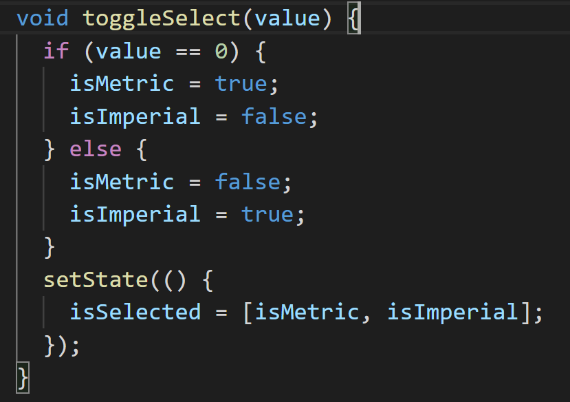 마지막으로 UI 업데이트를 하기 위해서 setState메소드를 호출해야 합니다. setState메소드를 호출하면서 isSelected에 업데이트된 isMetric과 isImperial값을 설정해 줍니다