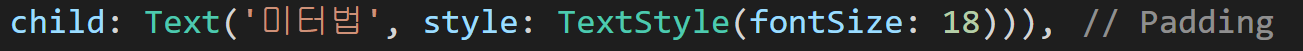 Padding의 child로 Text위젯을 설정해 주었고, style 인수에 TextStlyle로 fontSize를 18로 주었습니다.