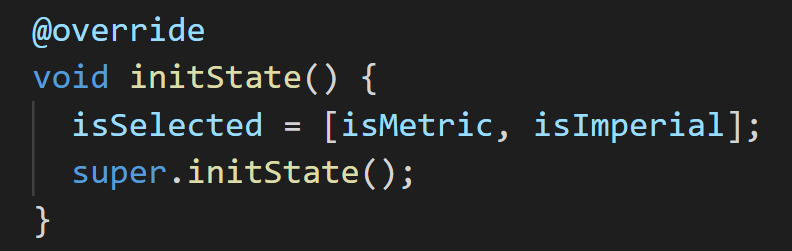 initState메소드에서 isSelected를 isMetric 과 isImperial값을 사용하도록 설정해 주었습니다. 이제 ToggleButtons위젯의 inSelected속성에서 초기화된 isSelected값을 이용할 수 있을 것입니다.