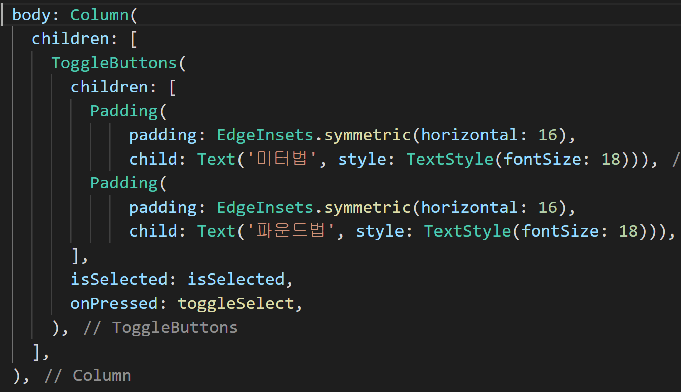 스캐폴드의 body에는 아래와 같이 Column위젯 안에 Togglebuttons위젯을 넣어주었습니다.