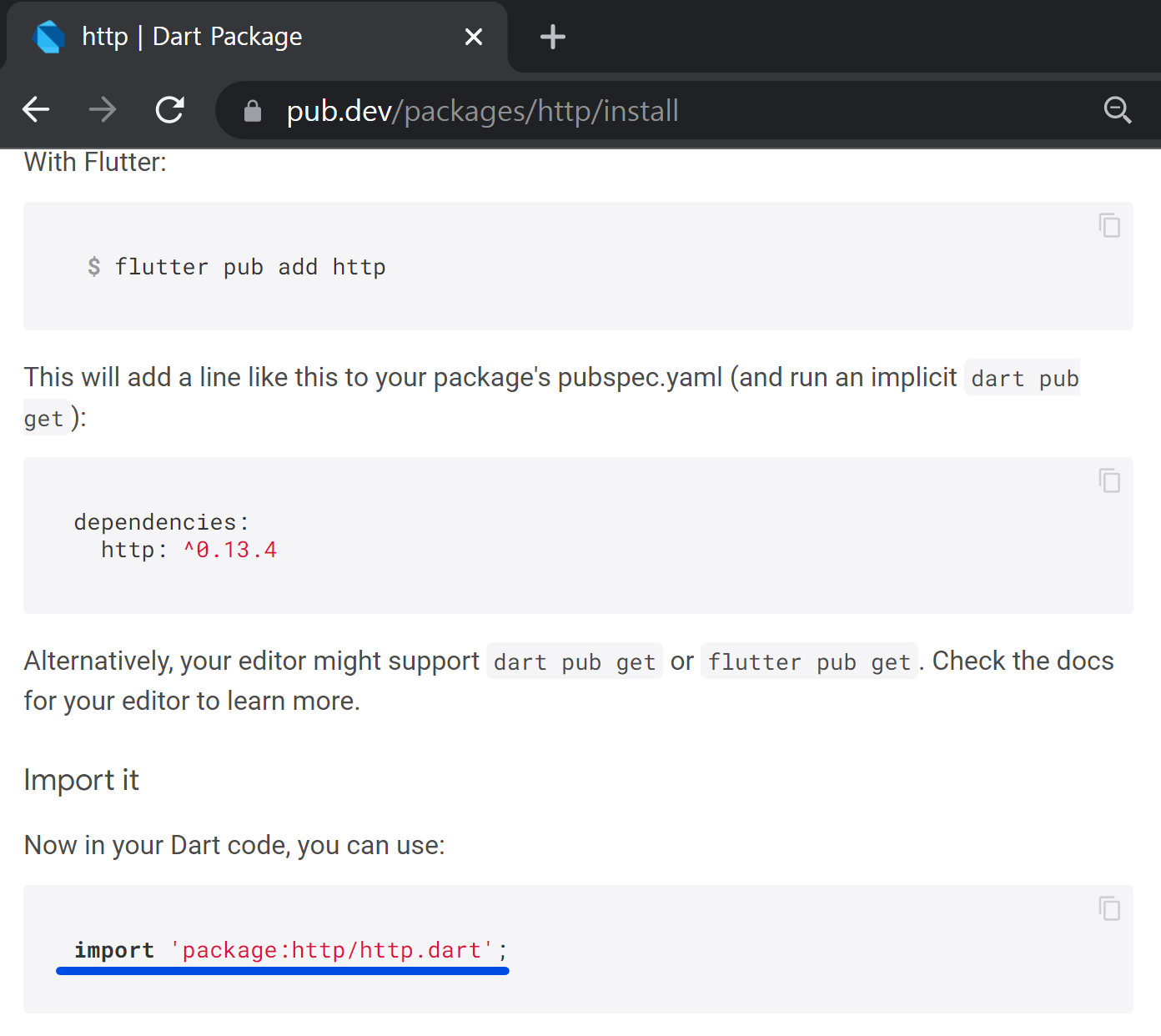 http패키지를 이용할 때는 pub.dev에 나와있는 import문으로 파일에서 선언하여 사용할 수 있습니다.