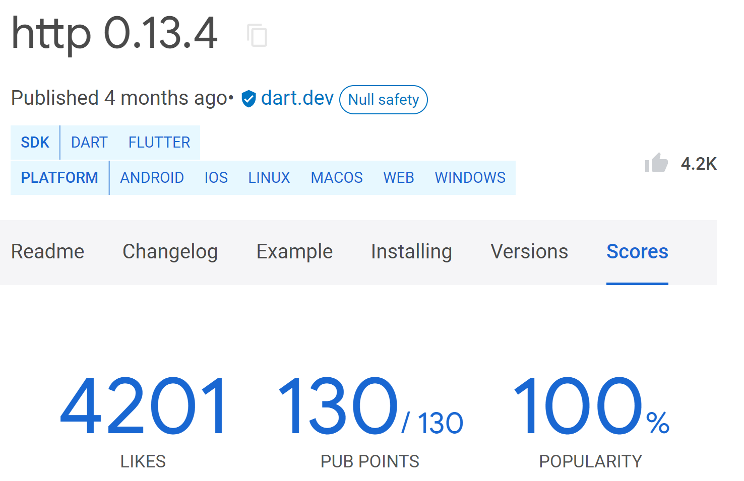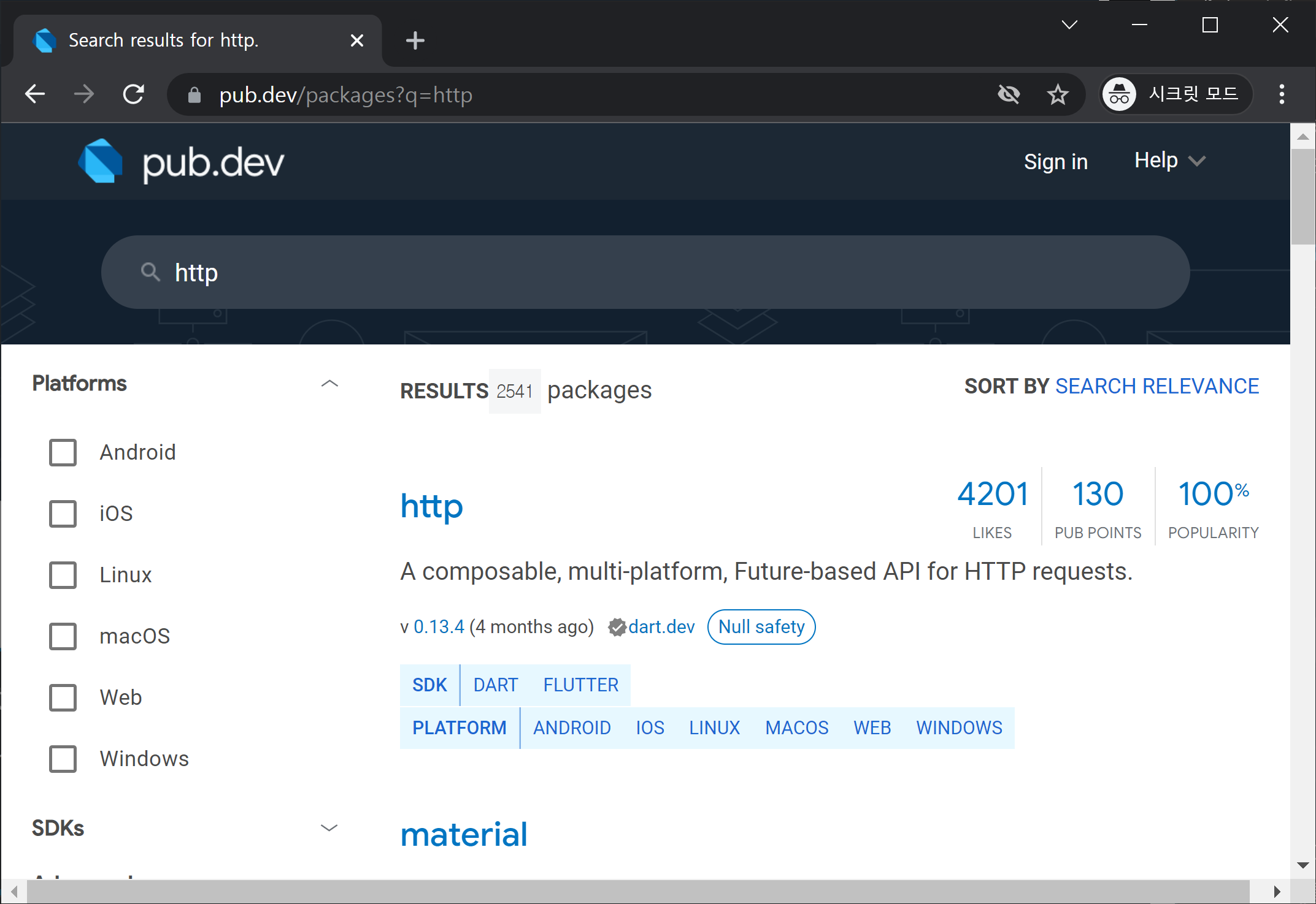 검색 결과 화면에서 패키지가 작동하는 플랫폼 목록, null safety 여부, 좋아요 수, 인기도 등 패키지에 대한 유용한 정보를 제공하고 있습니다. pub points는 패키지의 품질 점수를 나타냅니다. 품질 점수는 이 패키지가 신뢰할 수 있고 잘 유지된다는 것을 의미합니다.
