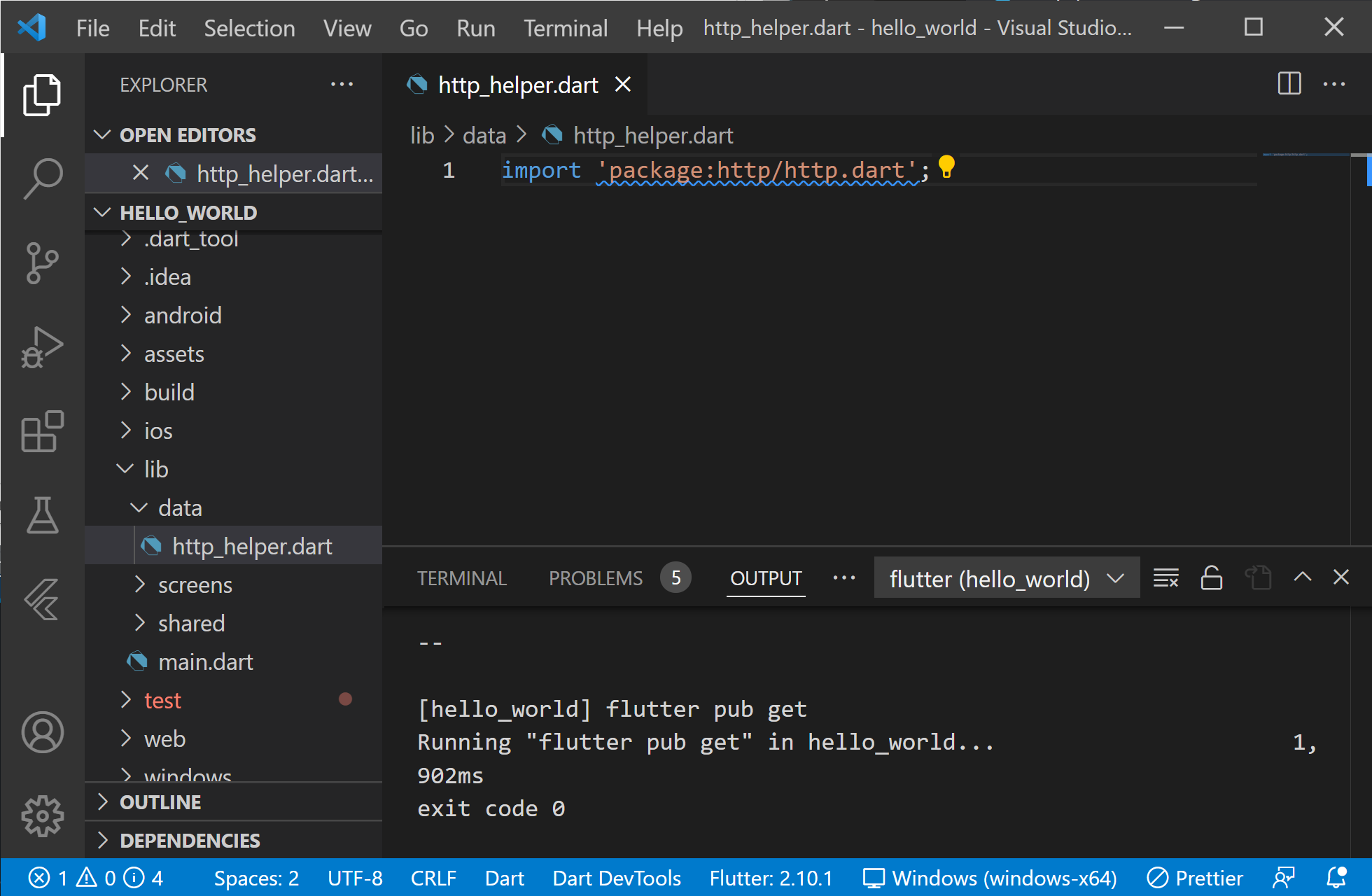 lib폴더에 data폴더를 생성하였고, http_helper.dart파일을 작성하였습니다. 이곳에서 http패키지를 사용하고 싶으므로 import문을 넣어 두겠습니다.