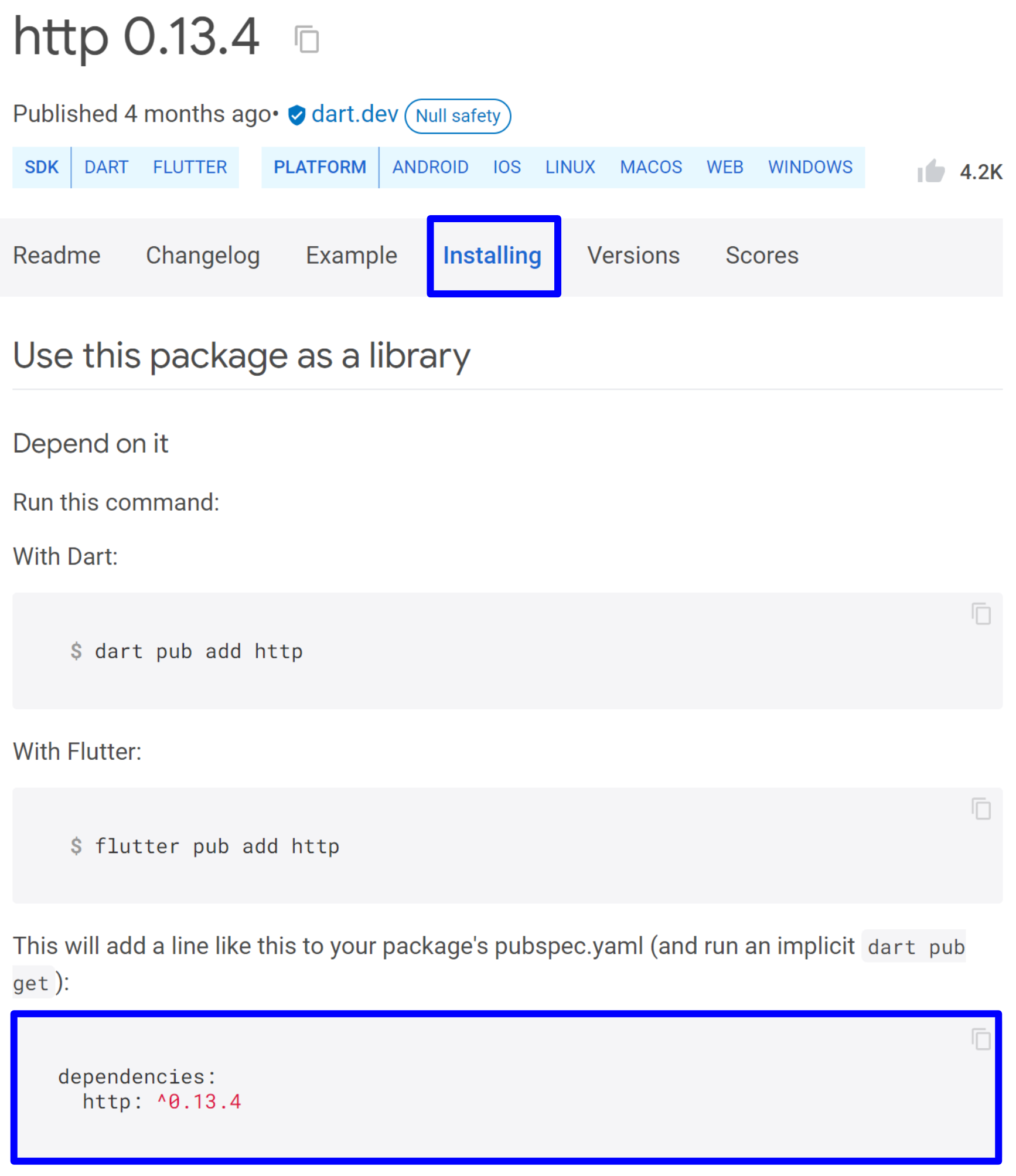 일반적으로 프로젝트에 종속성을 추가할 때 패키지 버전이 자주 변경되므로 pub.dev사이트로 이동하는 것이 좋은 습관이며, 개선 및 수정사항이 포함한 최신 버전을 사용하는 것이 좋습니다.