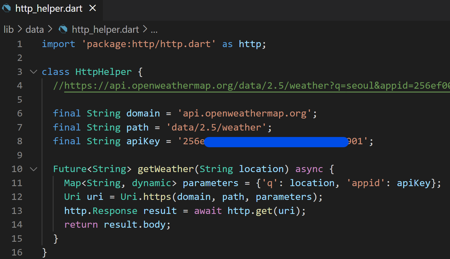 지금부터 만드려고 하는 날씨 페이지는 OpenWeather API에 연결하여 검색하는 도시의 현재 날씨 정보를 보여주는 기능을 넣으려고 합니다. 위 코드에서 주석 처리되 라인은 위에 브라우저에서 확인했던 특정 도시의 날씨 정보를 가져오는 openweather의 api call uri 입니다. 이제 이것을 플러터 앱에서 호출한 후에 위젯에서 출력하도록 할 계획입니다.