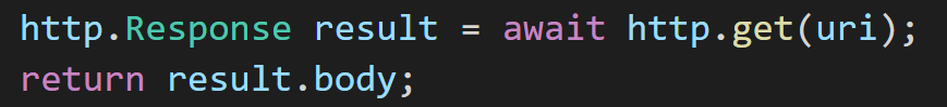 http.get메소드는 http get 통신이 이루어져 처리 시간이 오래 걸리기 때문에 비동기 처리가 필요한 부분입니다. http.get에 uri를 건네주고 비동기 처리를 위해 await 키워드를 넣어주었습니다. await를 사용하면 비동기식 코드를 동기식인 것처럼 순차적으로 작성할 수 있지만 await는 비동기 메서드 내에서만 사용할 수 있습니다. get의 리턴타입 은 http.Response 유형이 됩니다.