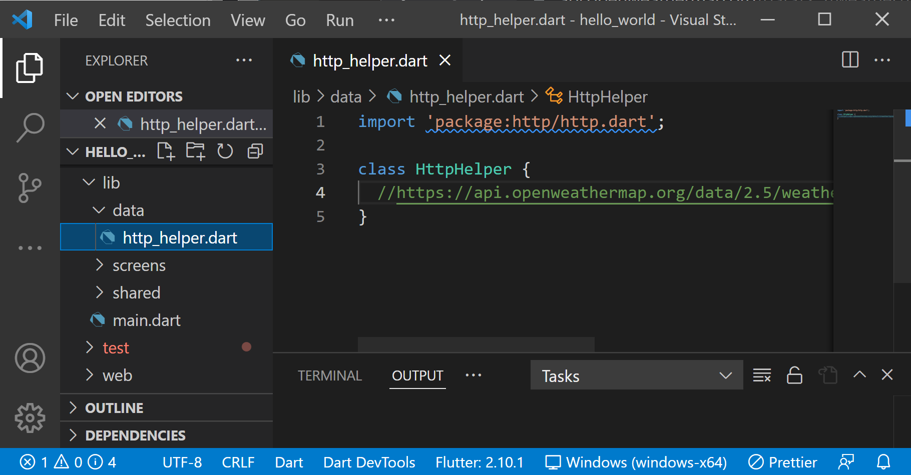 먼저 http 통신을 하기 위해 http 패키지를 import 하였습니다. 다음으로 HttpHelper라는 새 클래스를 만들었는데, 위젯이 아닌 일반 클래스입니다. 주요 차이점은 위젯은 UI의 일부이고 클래스는 단지 코드일 뿐입니다.