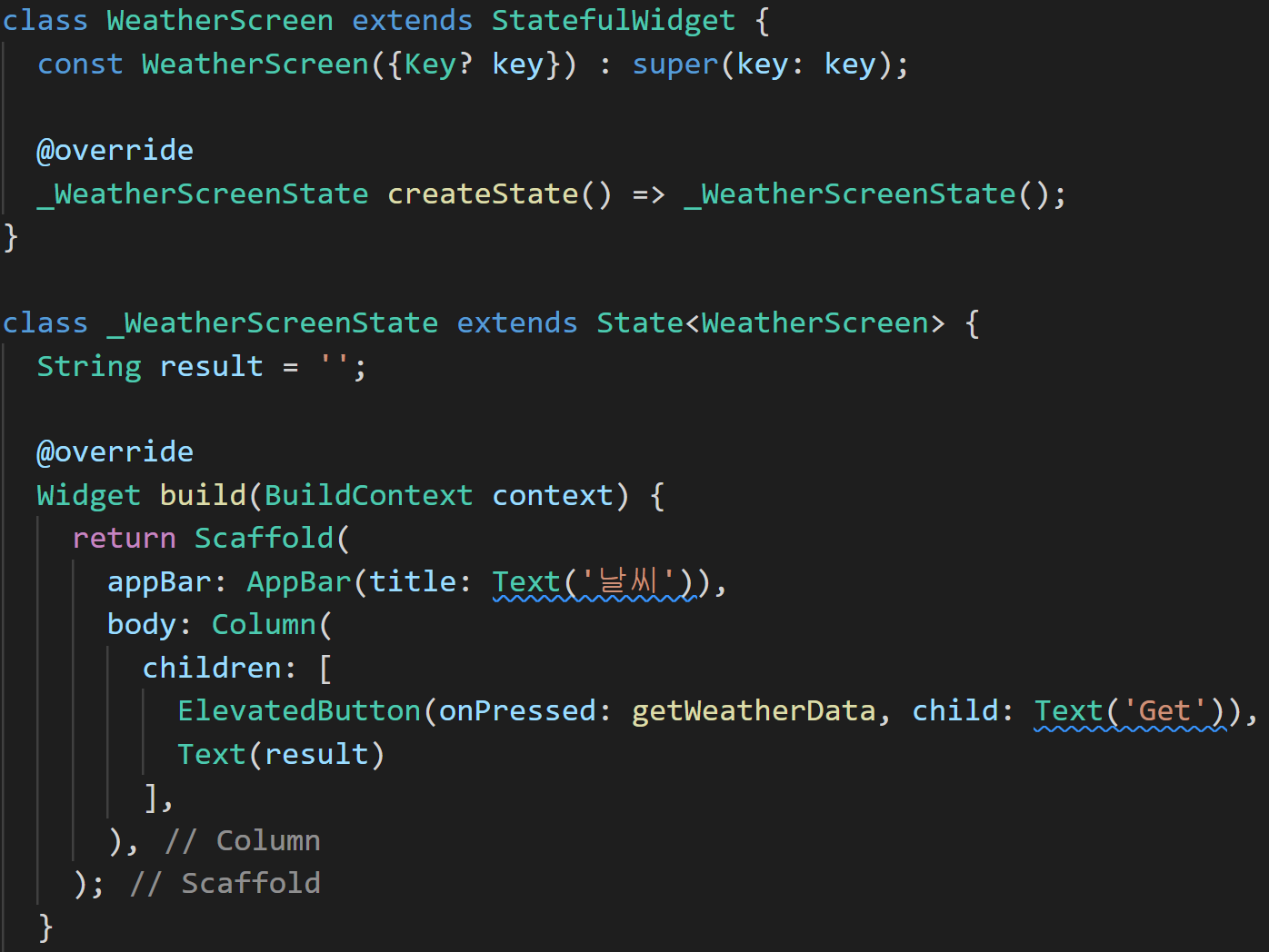 스캐폴드에 단순히 ElevatedButton 위젯을 설정하였고, 버튼이 눌렸을때 getWeatherData 메소드를 호출하도록 하였습니다. getWeatherData에서 http get을 호출할 계획입니다. 그리고 Text위젯에 날씨 정보를 할당해 줄 result값을 표시하도록 설정해 두었습니다.
