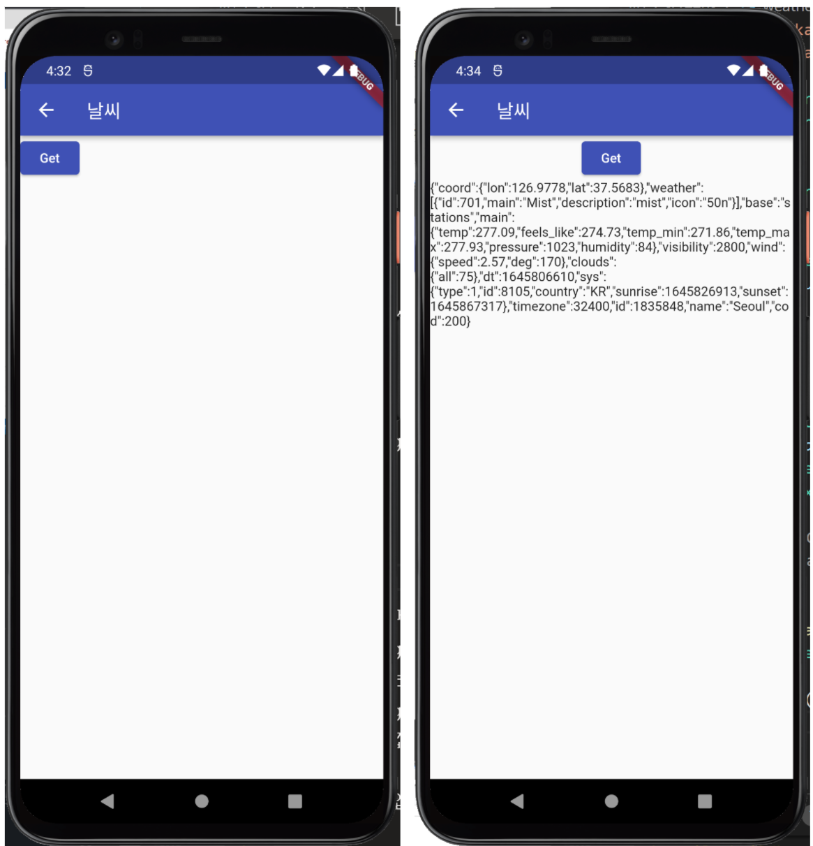 http get을 통해서 날씨 정보를 성공적으로 가져오고 있습니다.