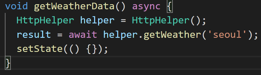 메소드 내에서 helper라는 HttpHelper 인스턴스를 선언하였고, helper인스턴스로 getWeather를 호출해 서울의 날씨 정보를 가져오도록 했습니다. HttpHelper의 getWeather는 비동기 함수 이므로 호출할 때 await 키워드를 달아주었고, await를 쓰기 위해서 getWeatherData메소드도 async 키워드를 붙여 주었습니다. 마지막으로 호출후에 결과값이 Text위젯에 갱신되어야 하므로 setState메소드를 호출하였습니다.