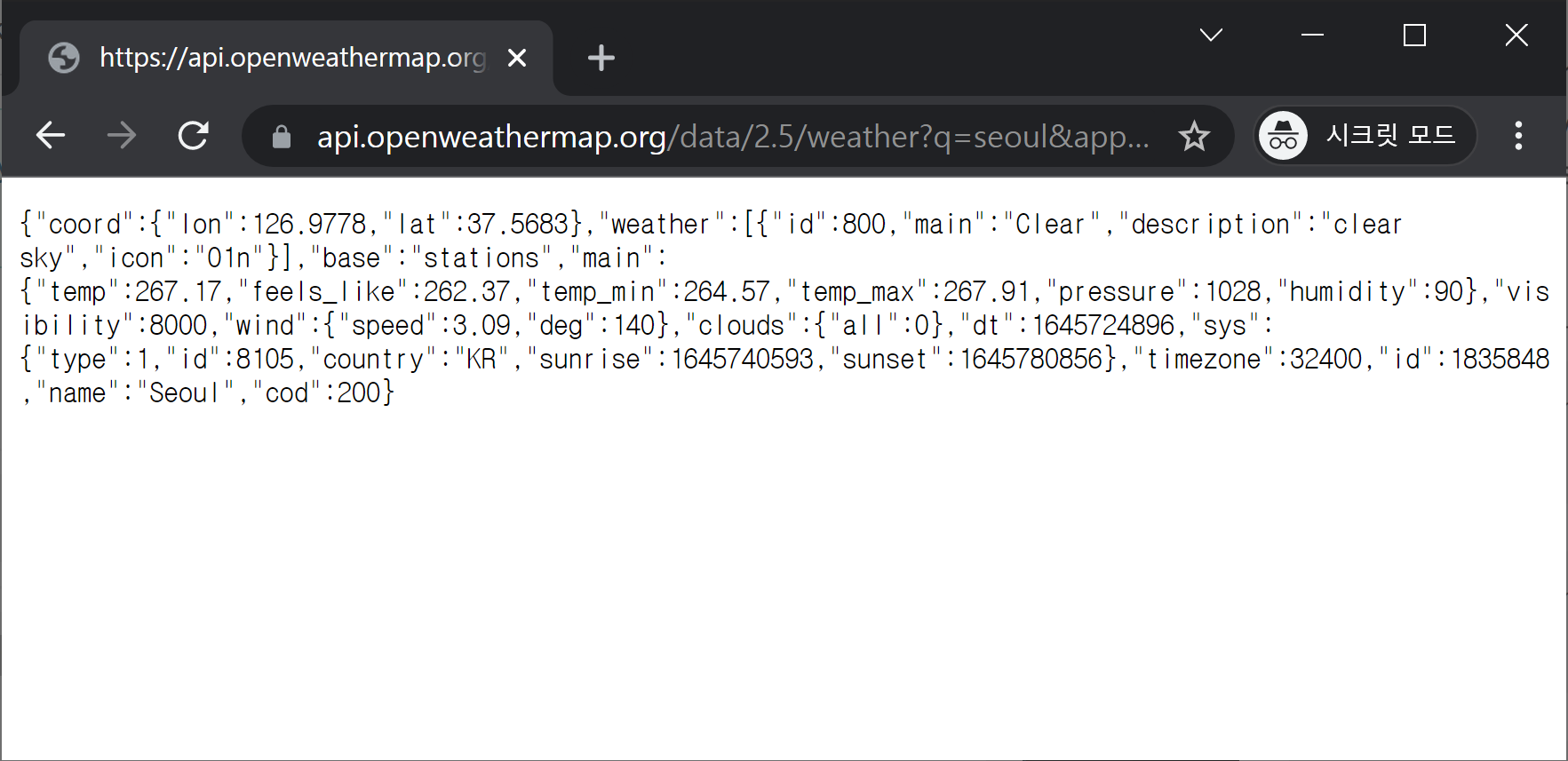 날씨 정보가 포함된 텍스트가 브라우저 창에 표시되면 발급받은 키로 API가 잘 작동하는 것 입니다.