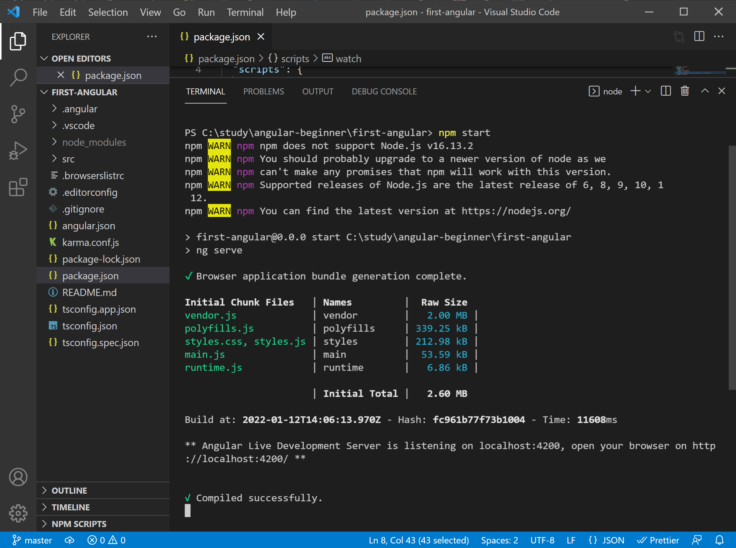 터미널에서 npm start 실행시키면,실행시키면 package.json 스크립트에 정의되있는 ng serve가 실행되고, 컴파일후 프로그램 번들을 생성합니다.