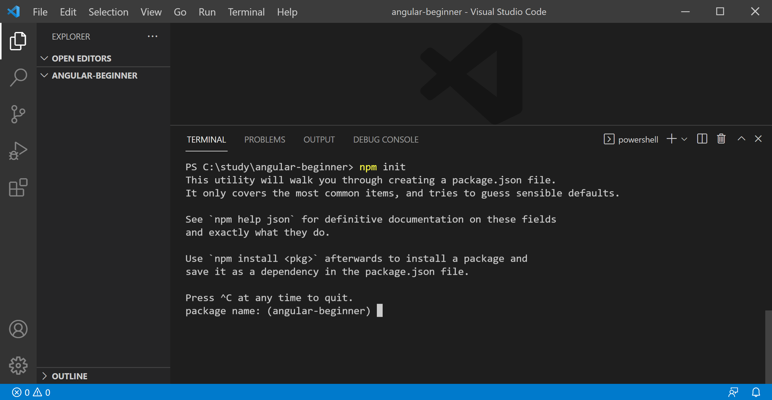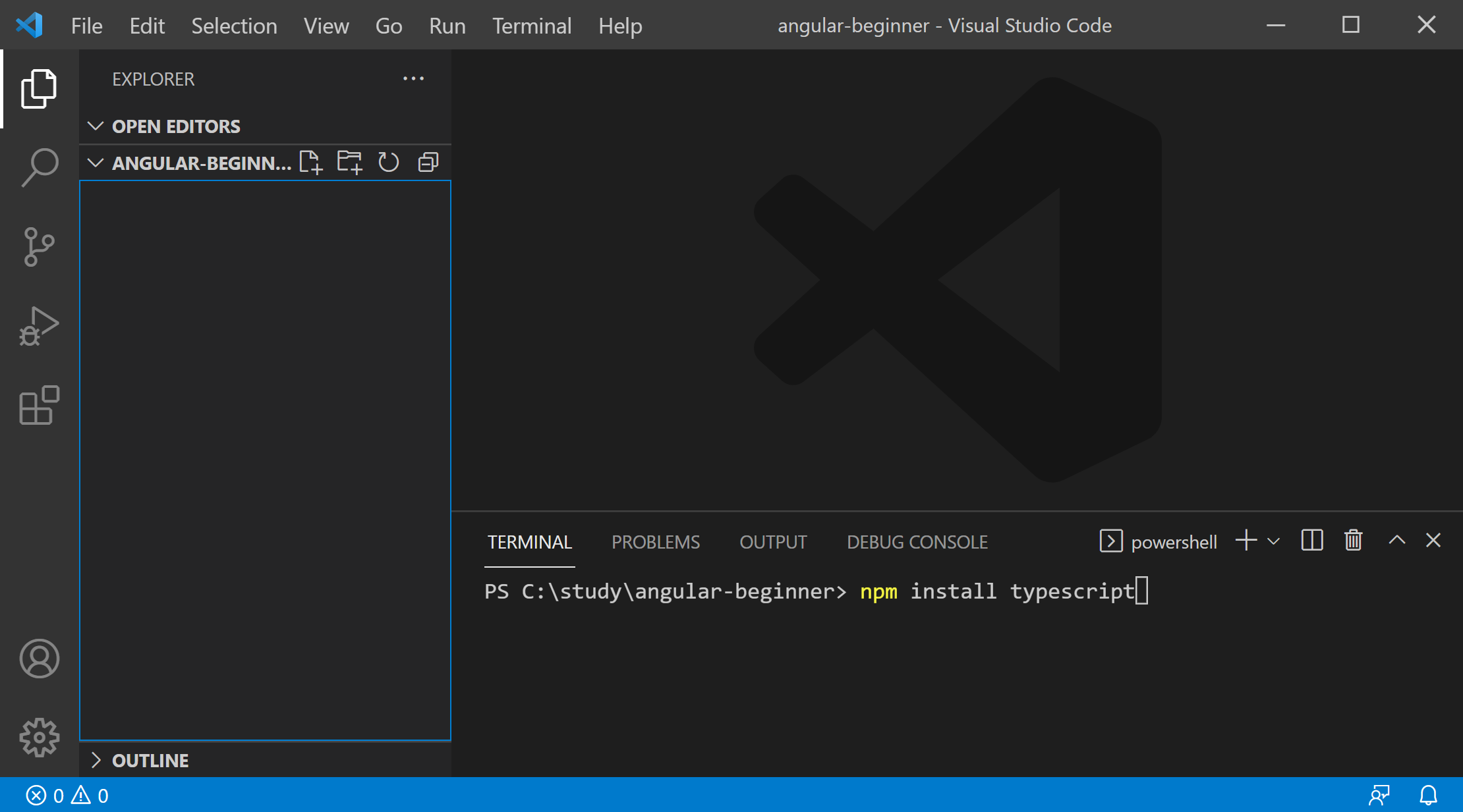 아래 그림에서 현재 c:/study/angular-beginner폴더에 있으며 아무런 파일이 존재 하지않는 빈 폴더 입니다.