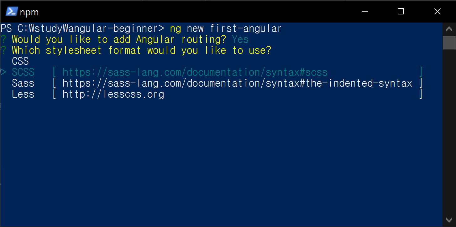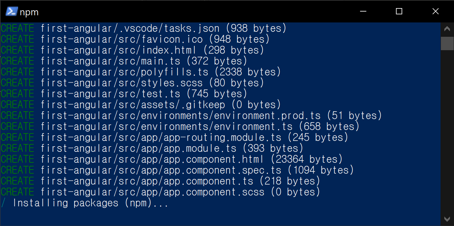 라우팅 설정은 yes, 스타일시트는 scss를 선택하고, 엔터를 누르면 앵귤러에서 필요한 모든 설정 및 구성 파일들을 생성 시작합니다.