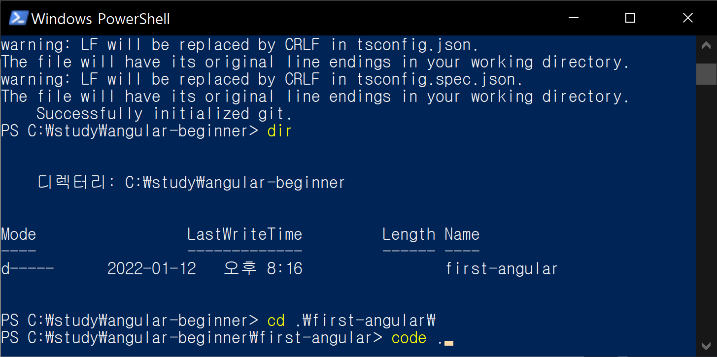 해당 폴더로 이동한후 code . 을 입력해 vscode로 프로젝트 폴더를 열어 봅시다.
