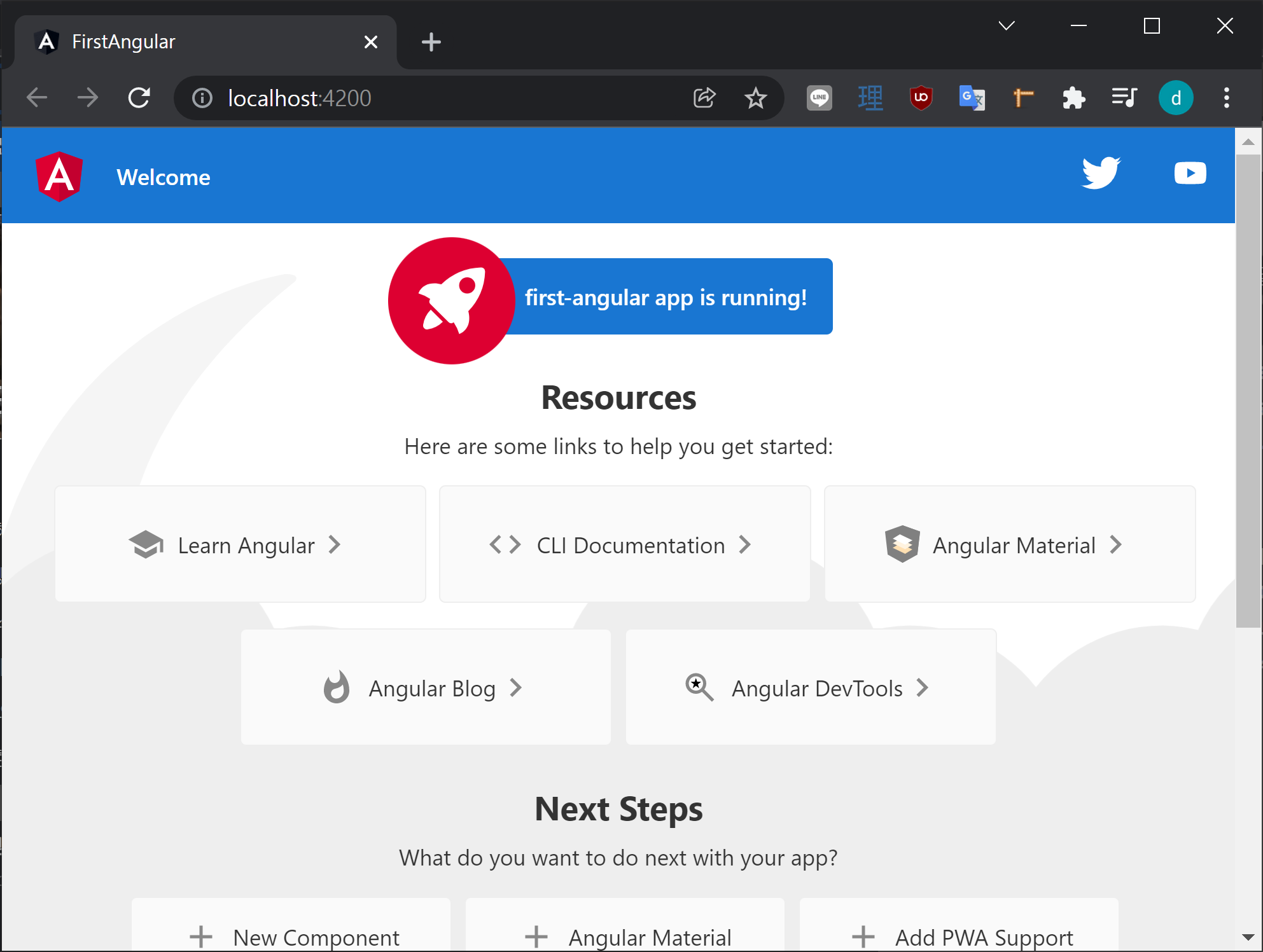 콘솔 메시지내의 링크를 클릭 하거나, 브라우저에서 localhost:4200 을 입력하면 앵귤러 애플리케이션이 열립니다.