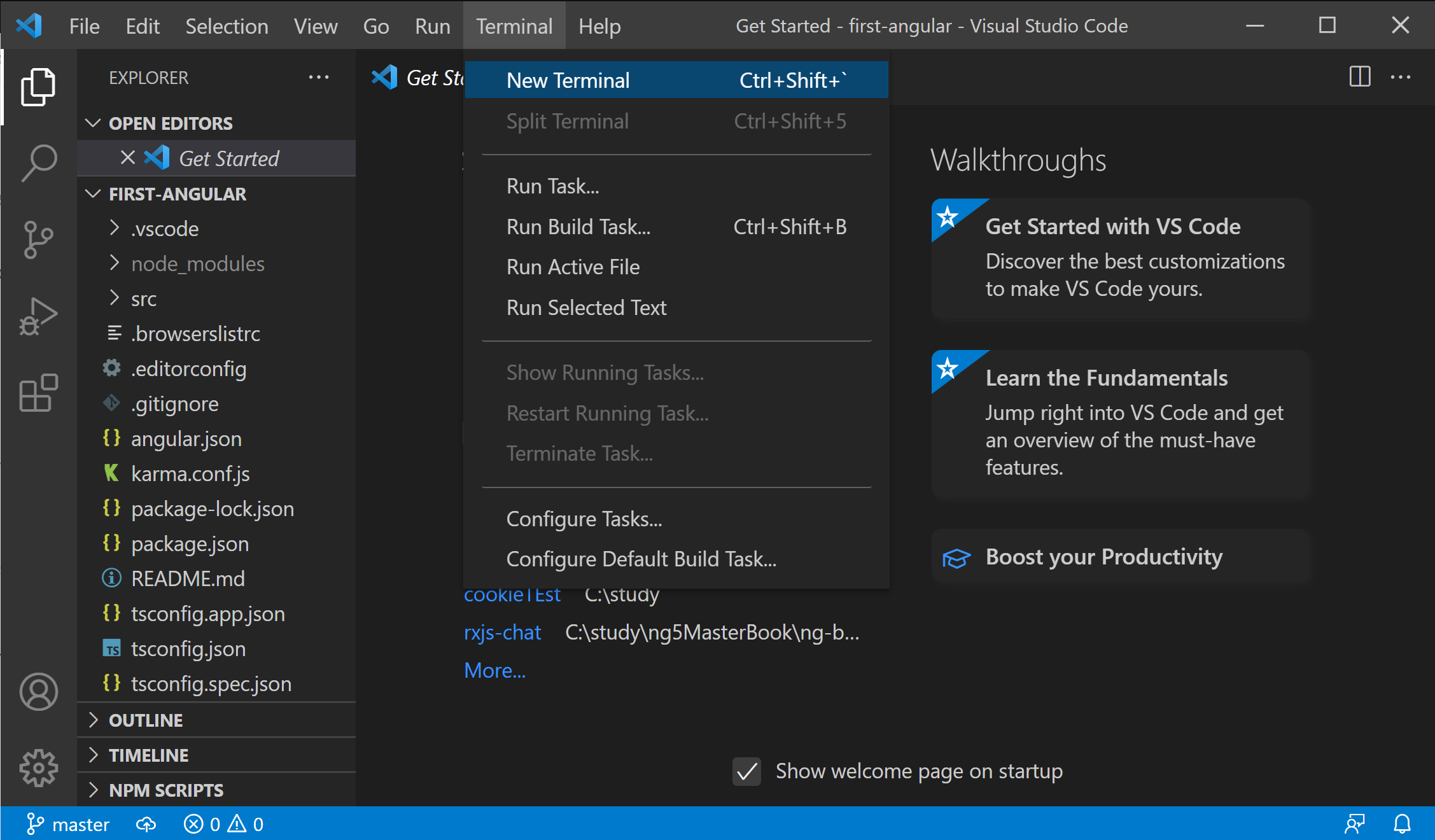 Vs Code에서 터미널을 열고 Angular CLI가 만들어준 애플리케이션을 구동해 보겠습니다.