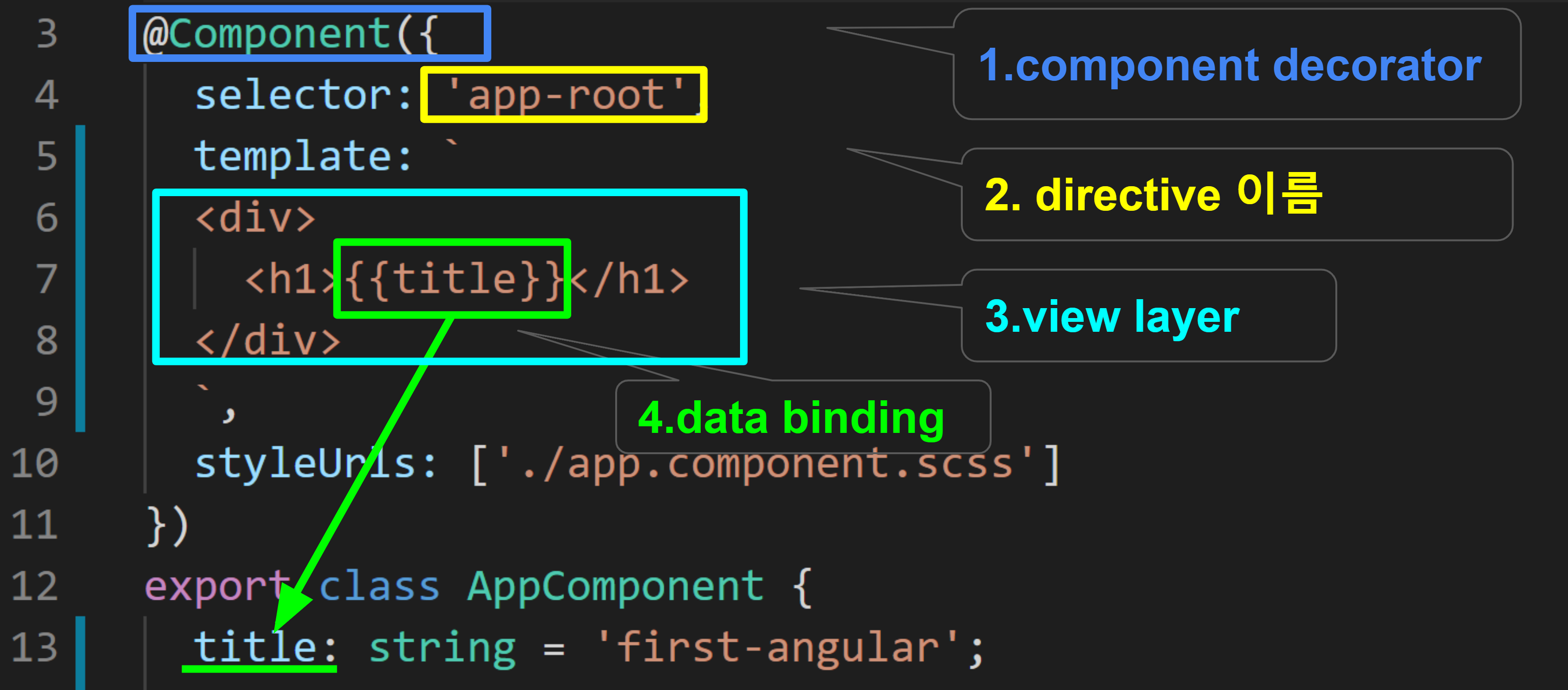 따라서 이 HTML이 렌더링렌더링 될 때 h1요소는 'first-angular'를 표시합니다.