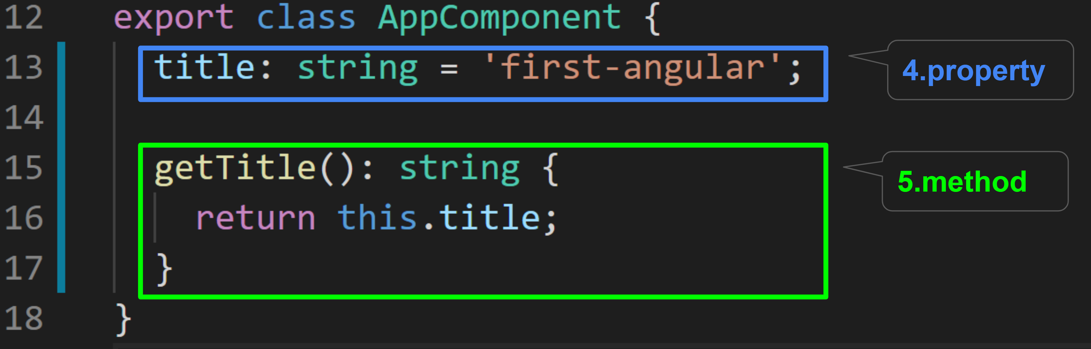 - 4. property는 클래스와 연결된 데이터 요소를 정의합니다. 이름의 첫 글자가 소문자인 camelCase입니다. 예제에서는 프로퍼티의 이름이 title입니다. title이라는 property명 뒤에 : string이라고 확인해 볼 수 있습니다. 이것은 Data Type이라고 합니다. 이 예에서 title의 타입은 string(문자열)입니다. 선택적으로 property에 기본값(default value)을 할당할 수 있습니다.