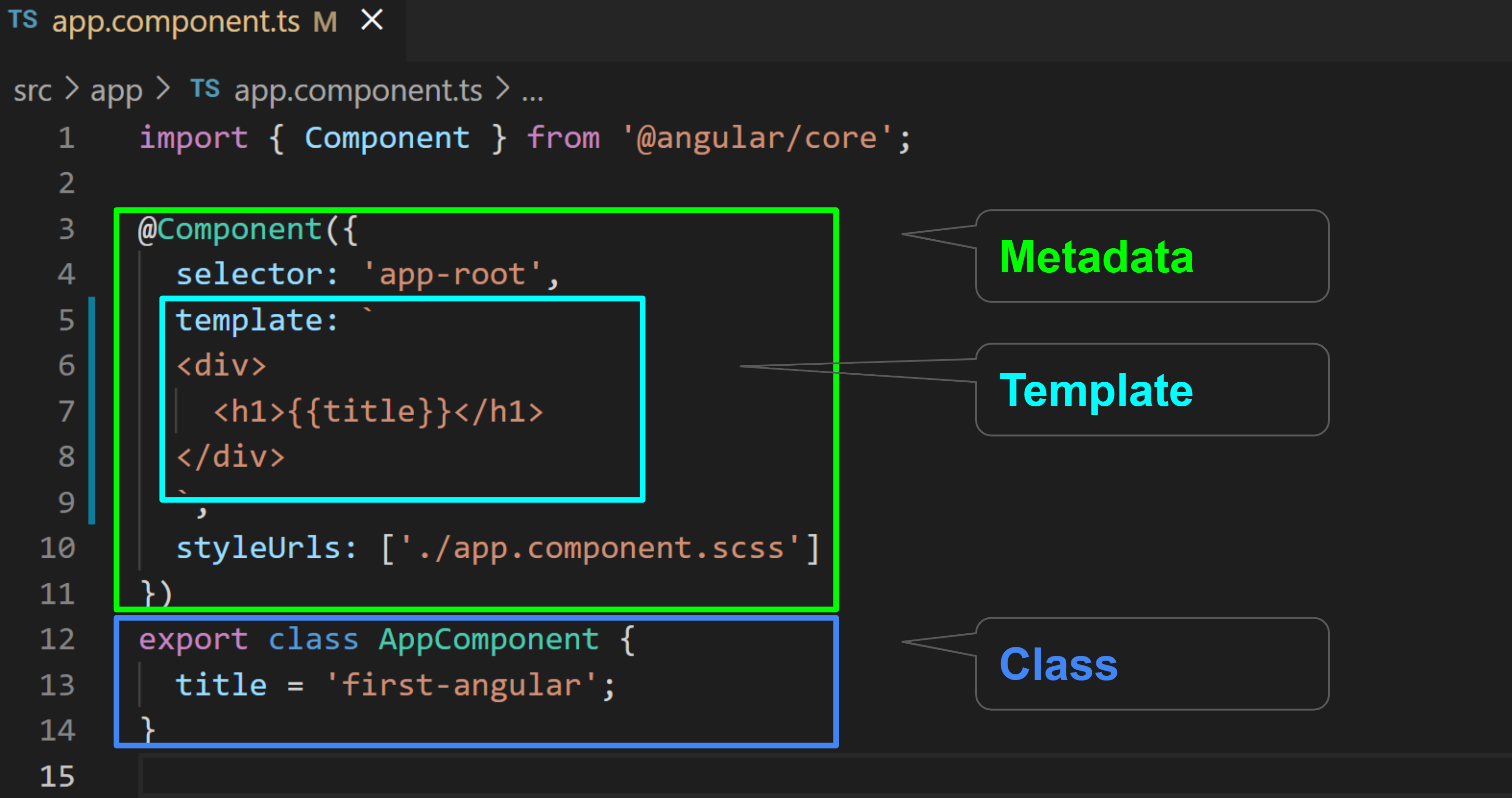 Angular는 component를 인스턴스화 하고 뷰를 구성하며 component와 상호작용하는 방법을 알기 위해 메타데이터를 필요로 합니다.