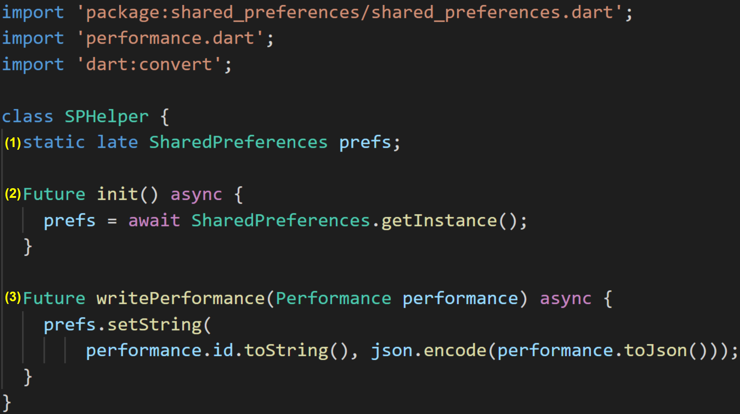 (1) 데이터를 읽거나 쓰려면 shared_preferences의 인스턴스가 필요합니다. SPHelper를 호출할 때마다 shared_preferences의 동일한 인스턴스를 써야 합니다. 따라서 prefs라는 SharedPreferences의 인스턴스를 static으로 선언하였습니다.