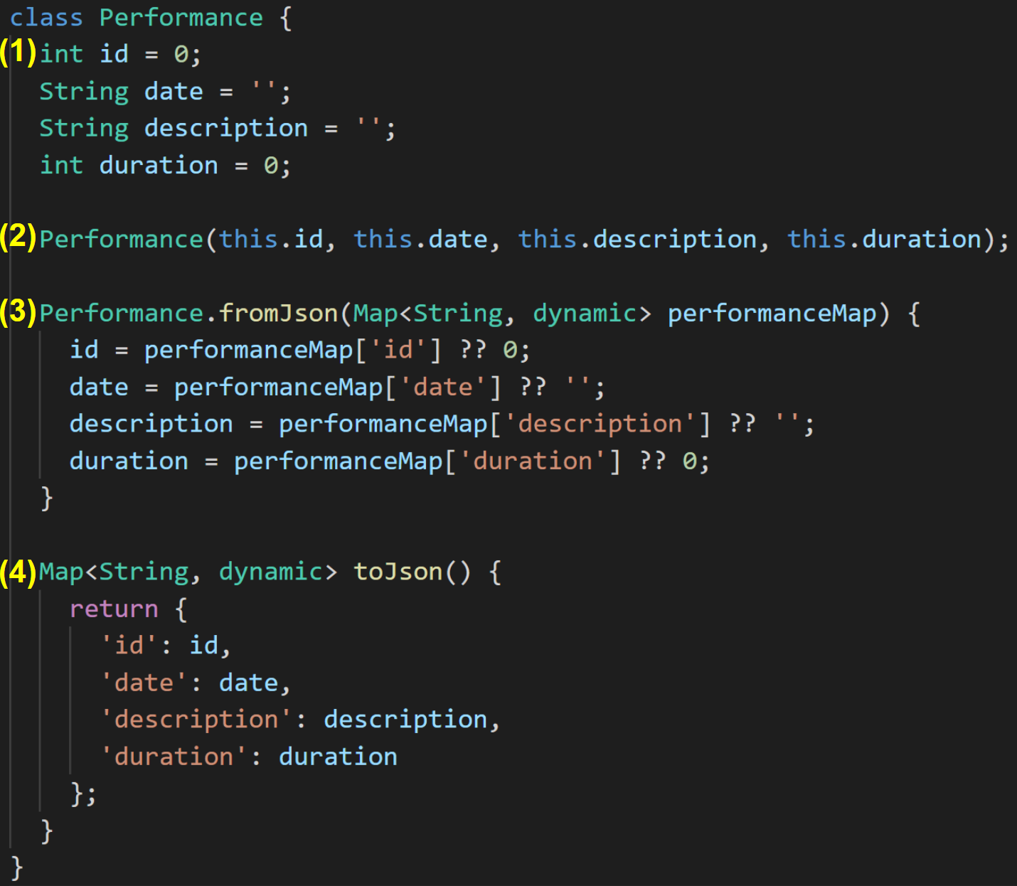 (3) named constructor인 fromJson에서는 map에서 Performance객체를 생성하고 있습니다.