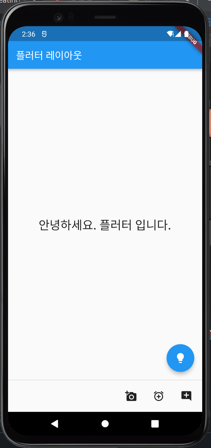 스캐폴드의 다른 프로퍼티인 floatingActionButton에 FloatingActionButton 위젯을 넣어주고 있습니다. child로는 Icon을 설정하였고, onPressed 매개변수로 버튼일 눌렸을 때 행동을 정의하였습니다. 예제에서는 단순히 콘솔에 문자열을 출력합니다. 디버그가 실행된 상태에서는 핫 리로드가 가능하므로 앱을 재실행하지 않고 저장만 해주면 에뮬레이터에서 코드가 반영됩니다. 화면을 보겠습니다.