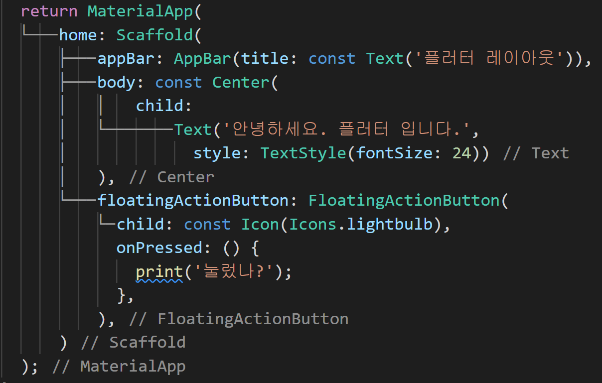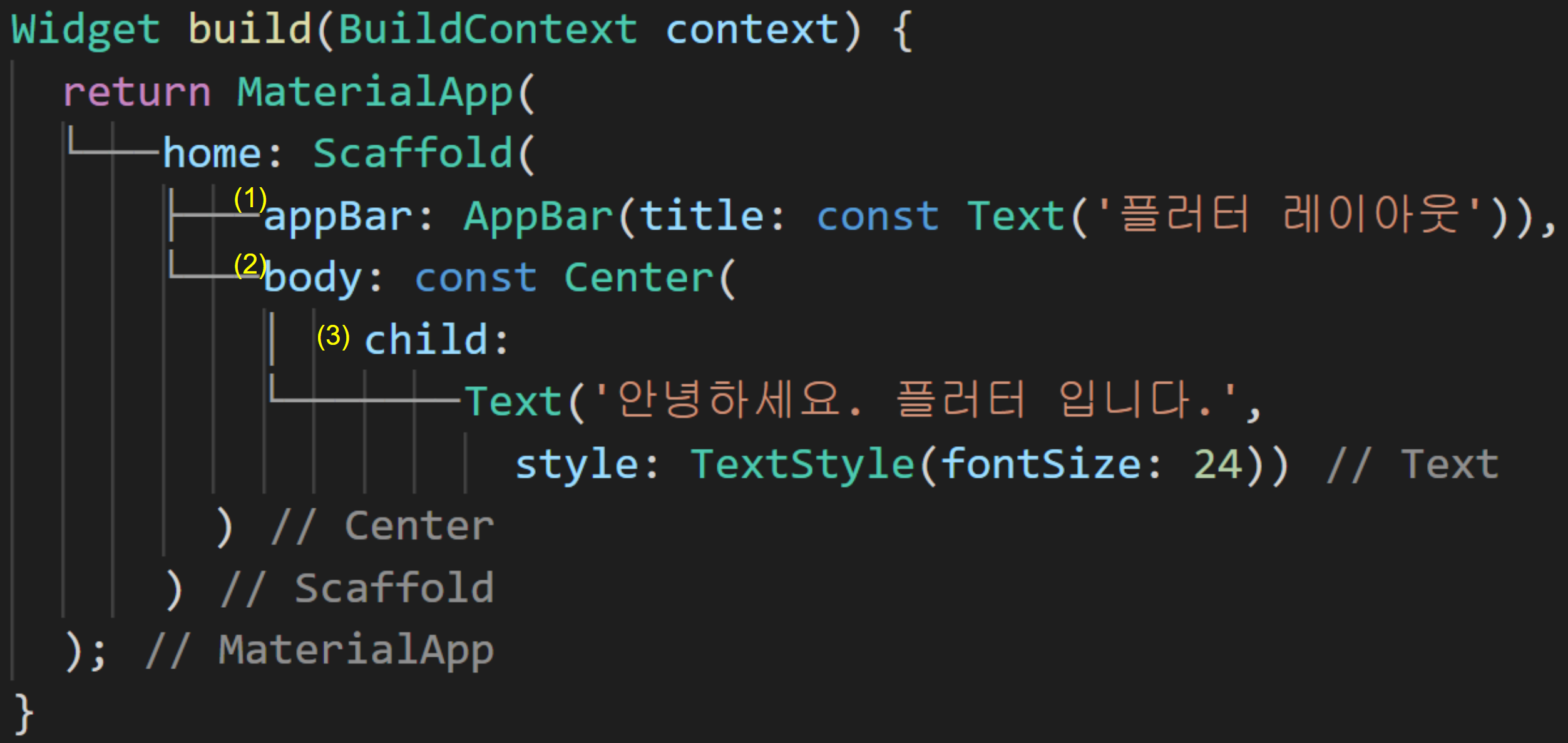 (3) child에는 Text위젯이 포함되어 있고, style 속성으로 TextStyle 위젯을 사용하여 폰트 크기를 24로 설정하였습니다.