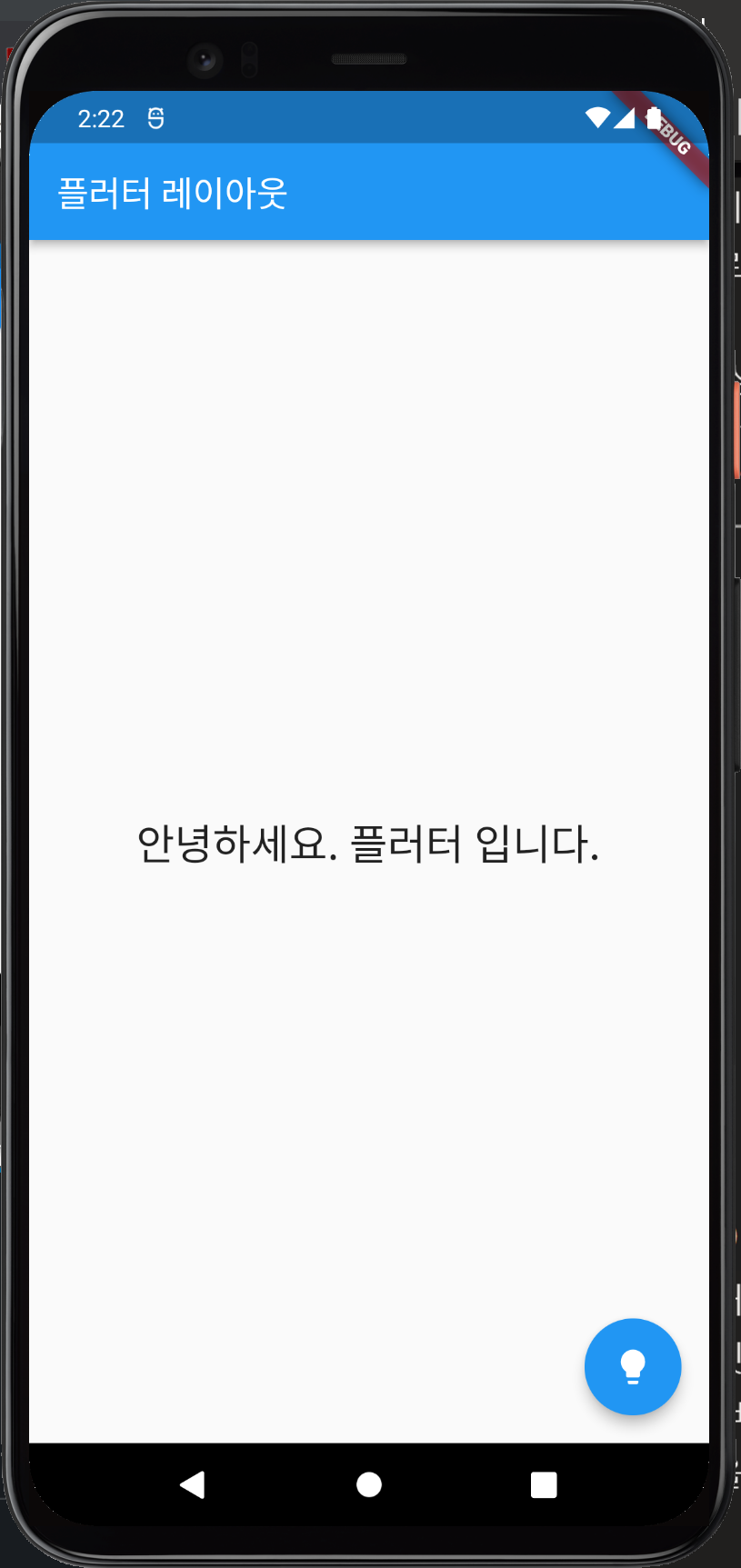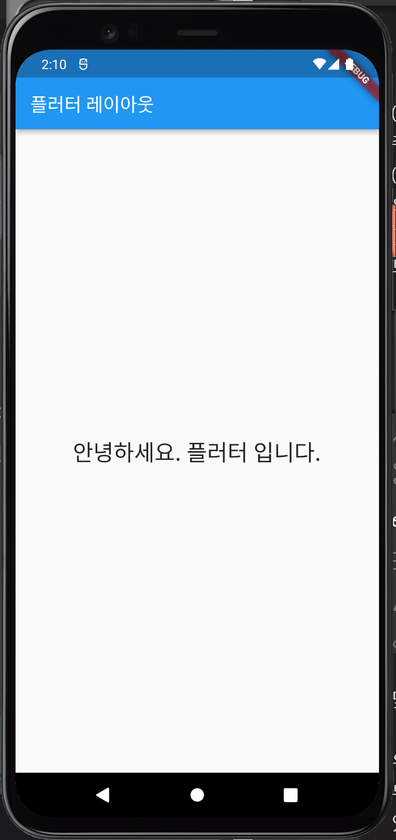 디버그 패널을 열고 디버그를 눌러 앱 화면에서 살펴보도록 하겠습니다. 이때 안드로이드 에뮬레이터 설정이 되어 있어야 합니다.