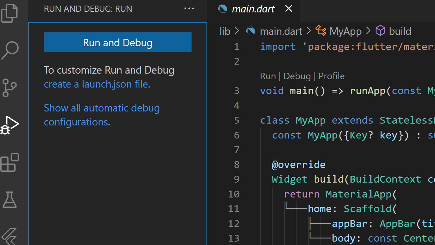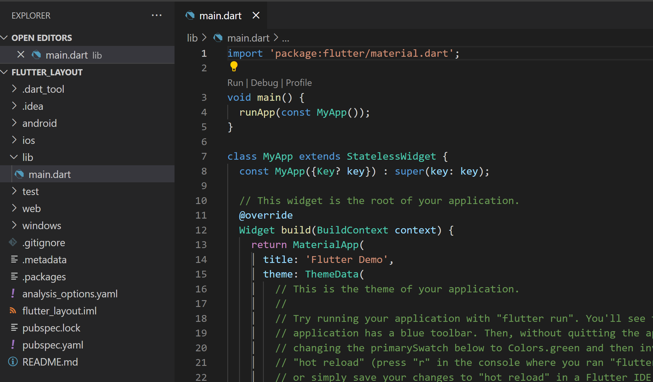 main.dart 파일에서 자동 생성된 모든 코드를 삭제한 상태에서 시작해 보도록 하겠습니다.