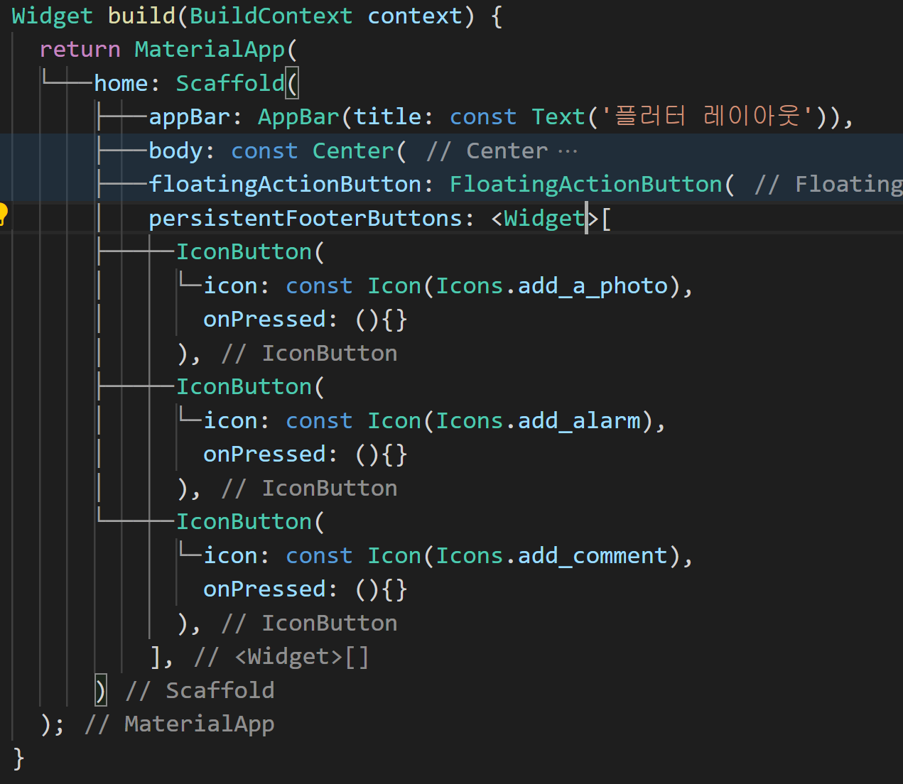 persistentFooterButtons 는 위젯 배열을 설정해 주고 있으며, 세 개의 IconButton 위젯을 넣어주고 있습니다. IconButton 위젯에서는 icon 프로퍼티에 각각 Icon 위젯을 onPressed 속성에는 빈 함수를 연결해 두었습니다.