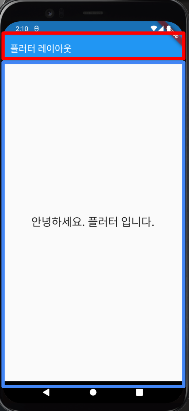 우리는 Scaffold 위젯의 두 가지 속성, appBar와 body를 사용했습니다. 아래 캡처에서 appBar는 빨간 상자, body는 파란 상자 영역입니다.