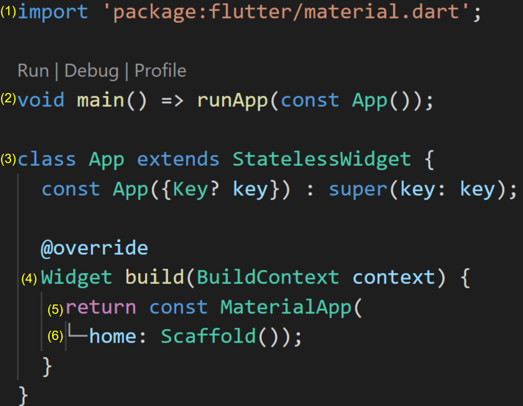 (2) Flutter 앱의 진입점은 main메서드 입니다. 여기에는 앱의 다른 모든 부분을 포함할 클래스를 가지는 runApp 명령이 포함되어야 합니다. runApp을 호출하면서 실제 프로젝트의 코드가 될 App을 건네주고 있습니다. 메인 메소드는 단 한 줄의 코드이므로 화살표 구문으로 만들어 주었습니다.