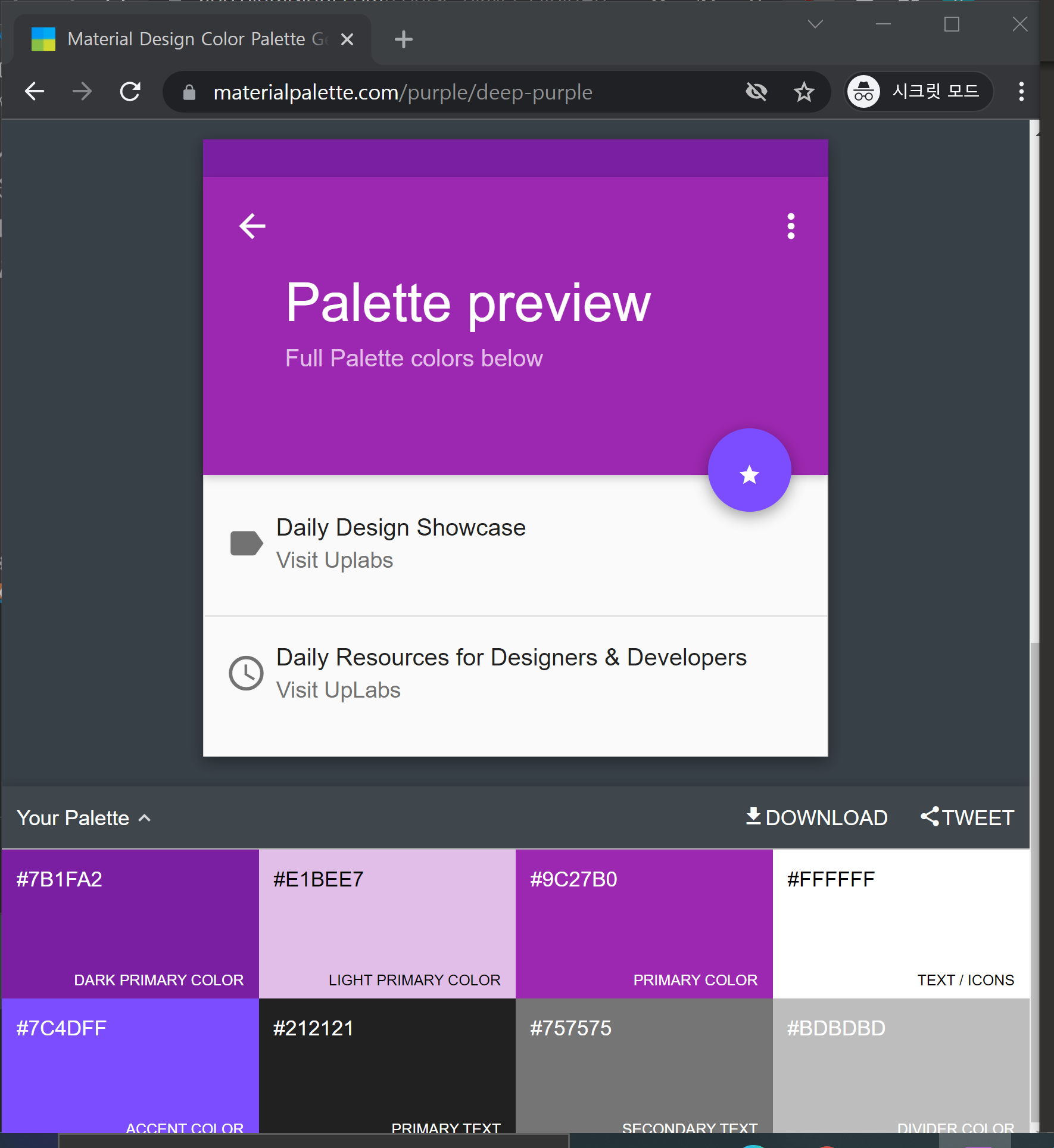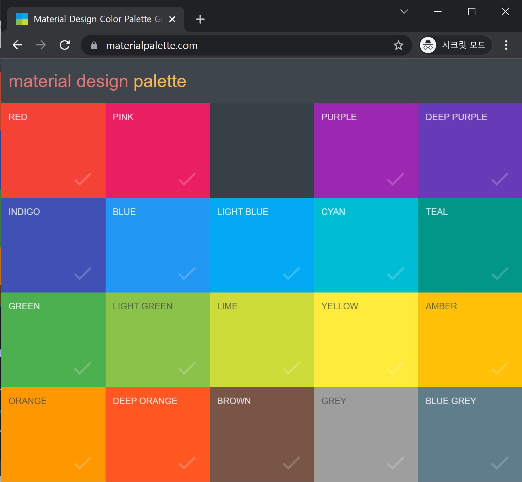 Material Palette 사이트는 앱에서 적절한 생상을 선택하게 도움을 주는 훌륭한 도구입니다.