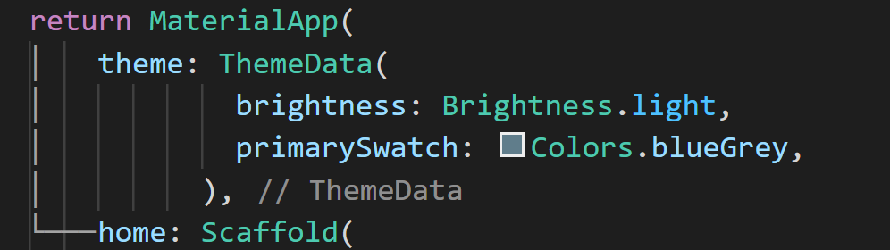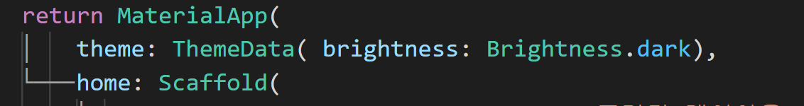 MaterialApp 위젯의 theme 속성에서 ThemeData 위젯을 사용할 수 있습니다. ThemeData에서 가장 눈에 띄는 변화를 주는 속성은 Brightness입니다. 이곳에서 간단히 플러터 앱의 다크 모드 설정을 할 수 있습니다.