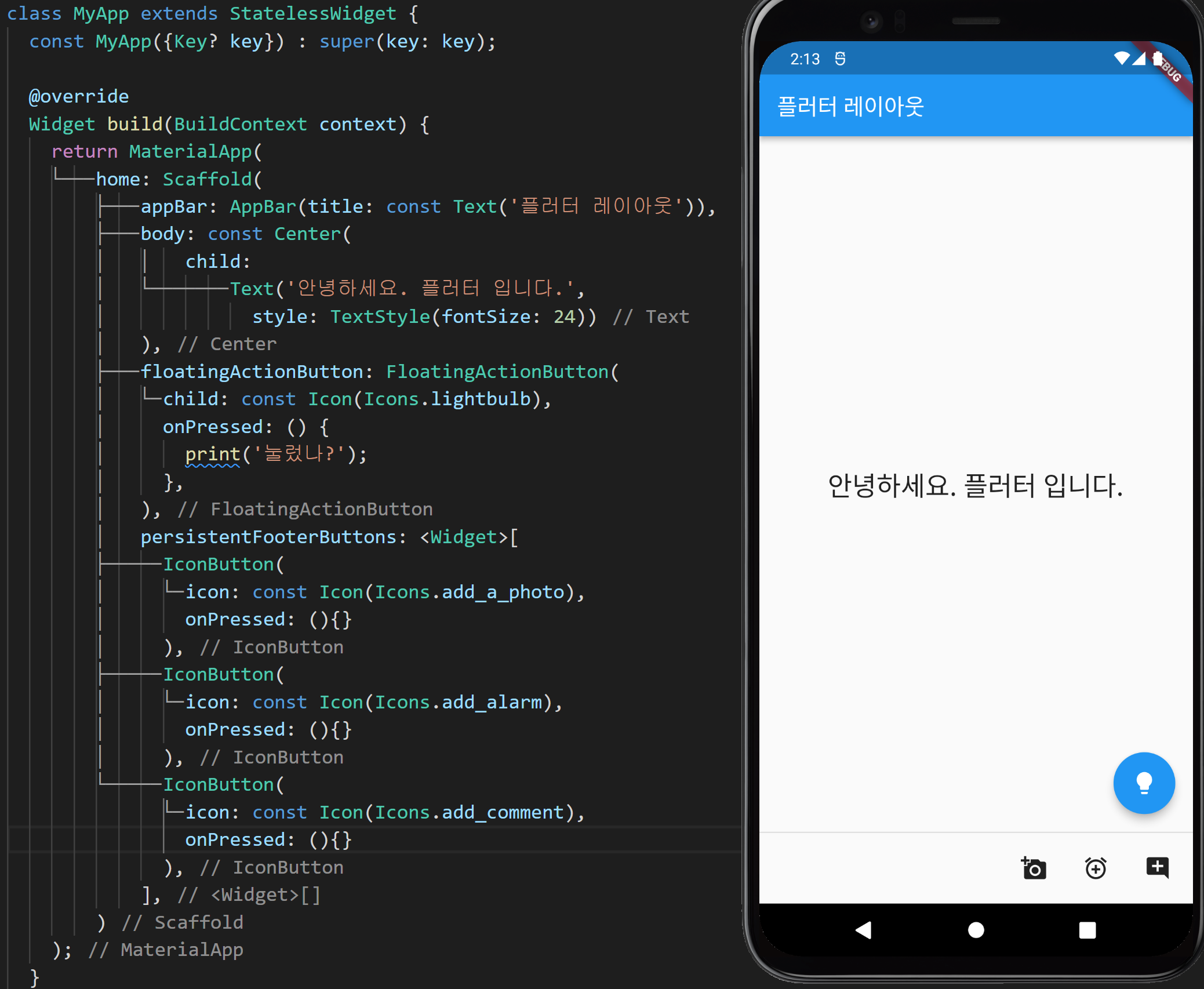 여기까지 수고하셨습니다. 다음 포스트는 레이아웃에서 빼놓을 수 없는 Container위젯에 대해 알아보도록 하겠습니다.