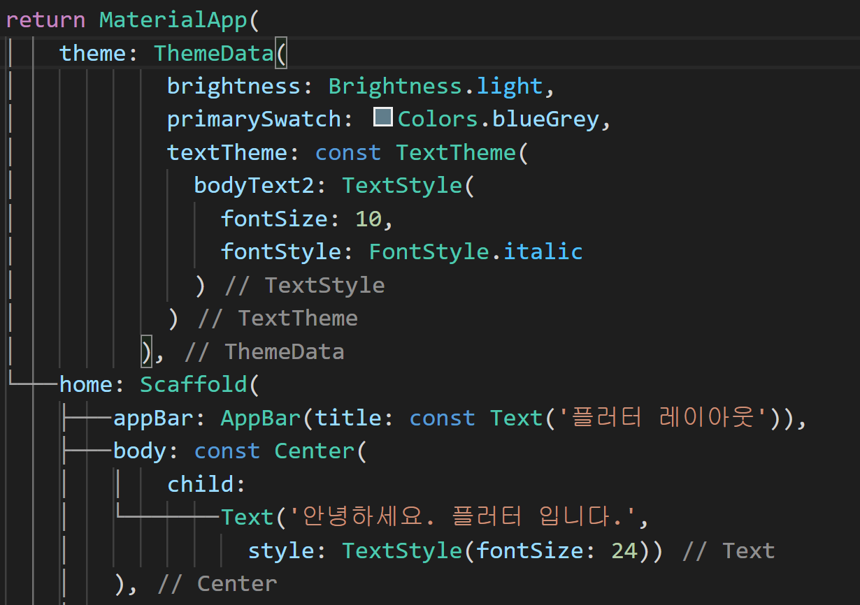 위 코드에서 textTheme을 fontSize가 10이고 fontStyle이 FontStyle.italic인 TextStyle을 설정하였습니다. 물론 테마를 사용하는 대신 앱의 각 위젯에서 색상을 선택하고 텍스트 스타일도 지정할 수 있습니다. 실제로 예제에서 하위 위젯인 Text 위젯에서 TextStyle로 fontSize를 24를 주고 있는데 이렇게 하면 fontSize는 하위 위젯이 우선시되어 24로 할당되고 fontStyle은 theme에서 넣어준 italic으로 설정됩니다.