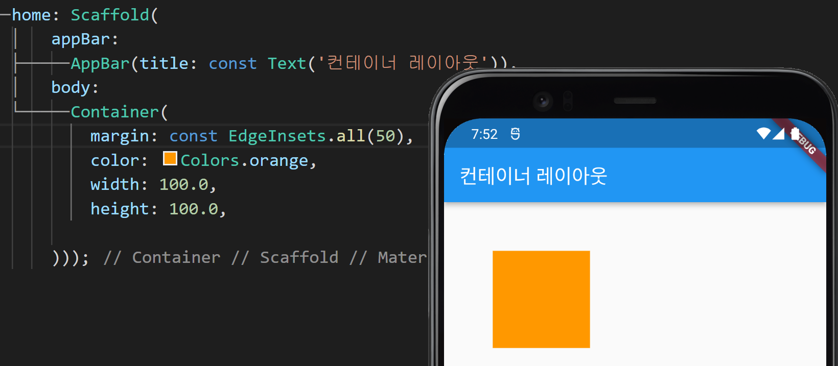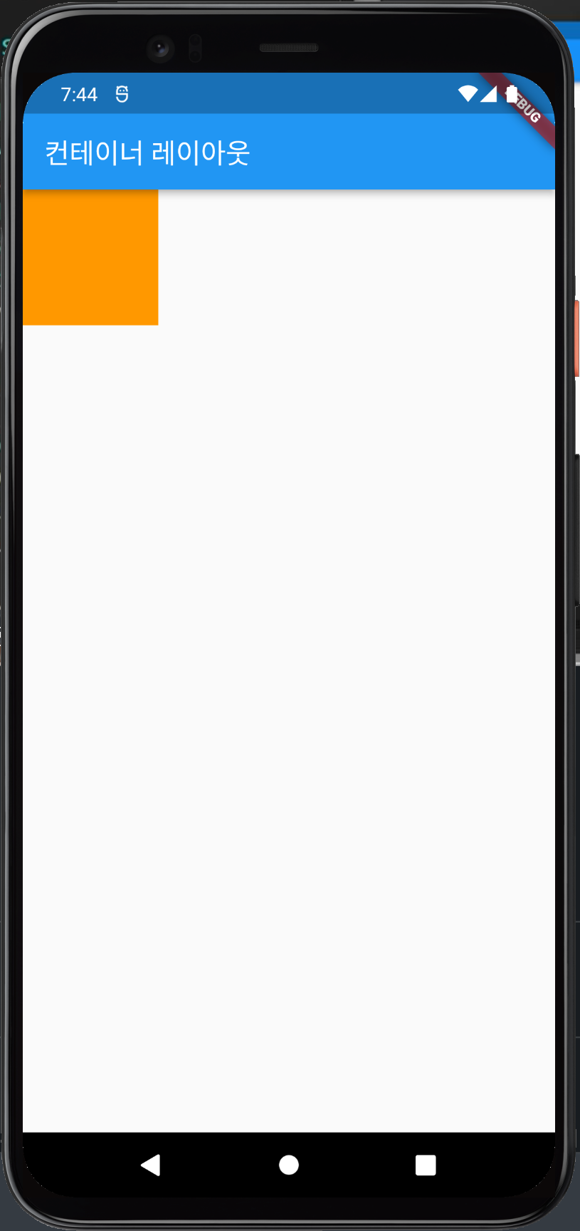 사각형 컨테이너가 scaffold의 왼쪽 상단에 위치해 있습니다. 컨테이너를 이동하기 위해선 어떻게 해야 될까요? 가장 쉬운 해결책은 마진 속성을 추가하는 것입니다.