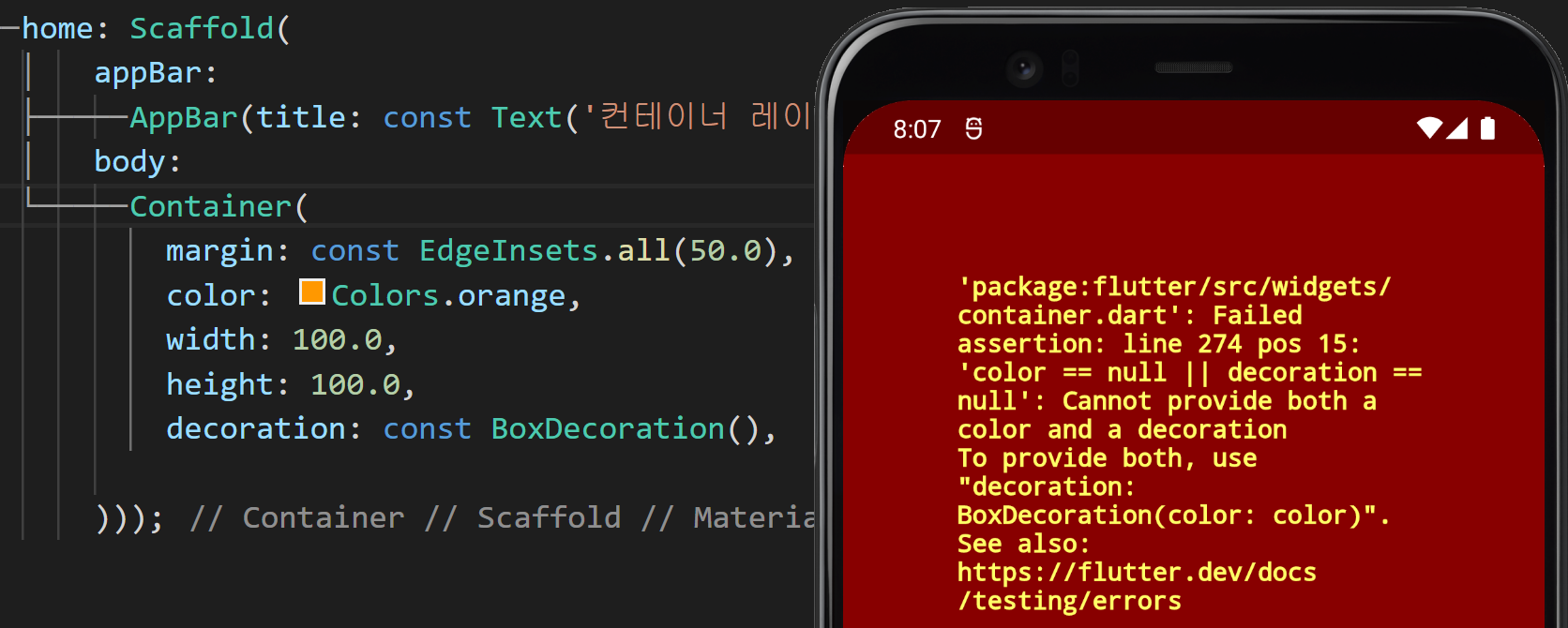 decoration 속성을 설정해주자 에러가 납니다. 이유는 color 속성이 BoxDecoration color의 속기(shorthand)이기 때문입니다. 따라서 decoration 속성을 명시적으로 지정하면 color를 BoxDecoration으로 이동해야 합니다.