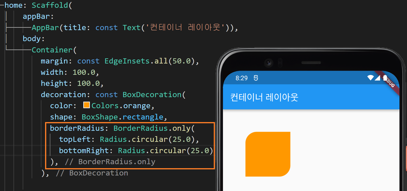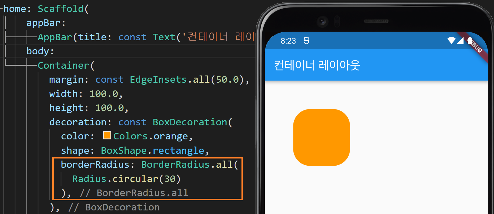 BoxDecoration에 borderRadius 속성을 추가해 보겠습니다.