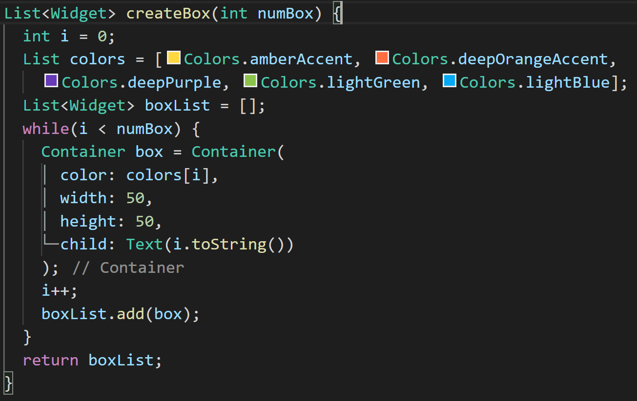 위젯을 인식하는데 도움이 되는 색상의 목록 colors를 만들었습니다. 또 boxList란 이름으로 위젯 리스트를 만들었습니다. while문에서는 함수에 전달된 numBox의 수만큼 반복하면서 너비와 높이가 50인 i값의 배열에 색상이 있는 Container 위젯을 만든 후 boxList에 추가하고 있습니다.