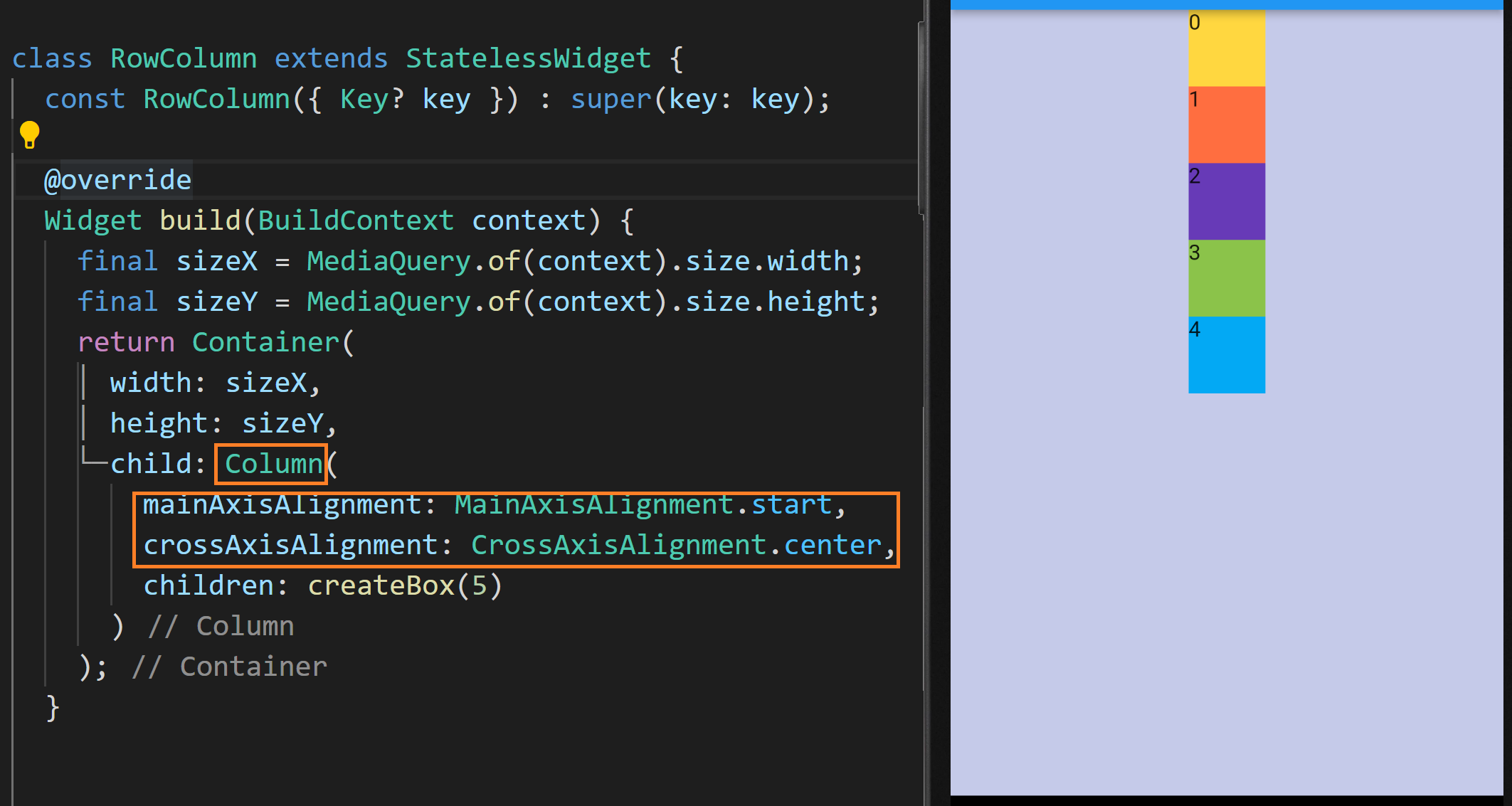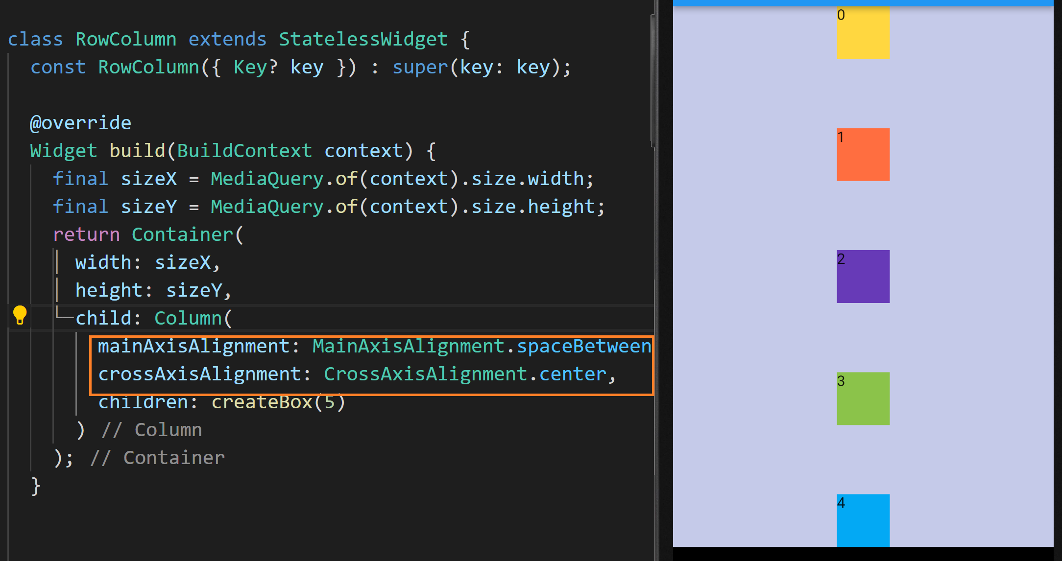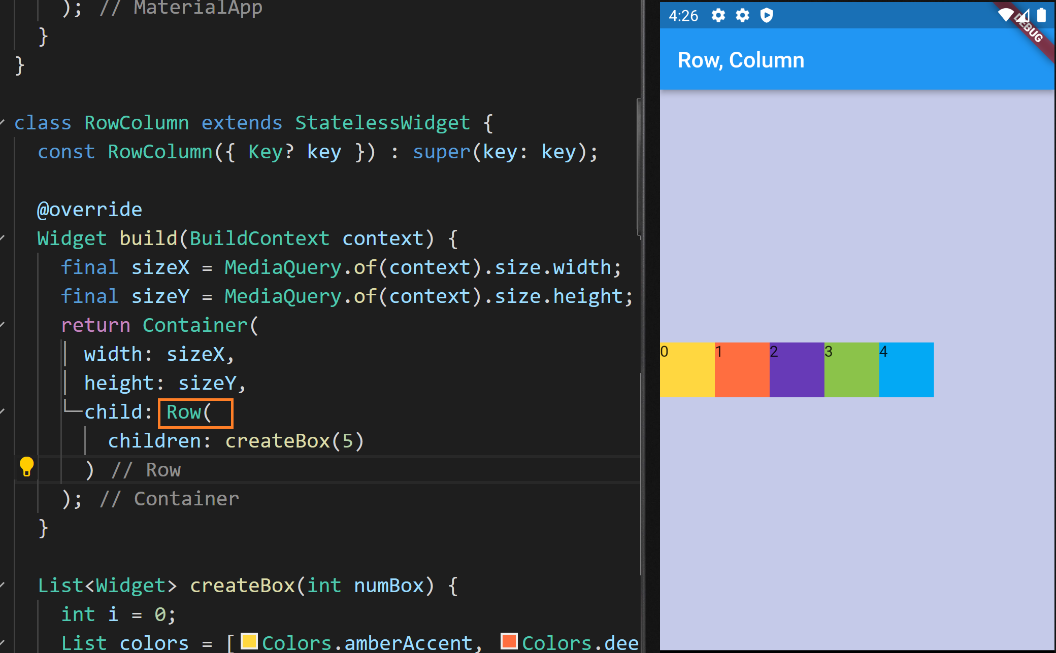 현재 컨테이너의 child는 Column으로 설정돼있고 그 안에 createBox가 호출되어 위젯 리스트가 설정되고 있습니다. 화면에 보다시피 사각형들이 화면 상단에서 열 방향으로 있습니다.
