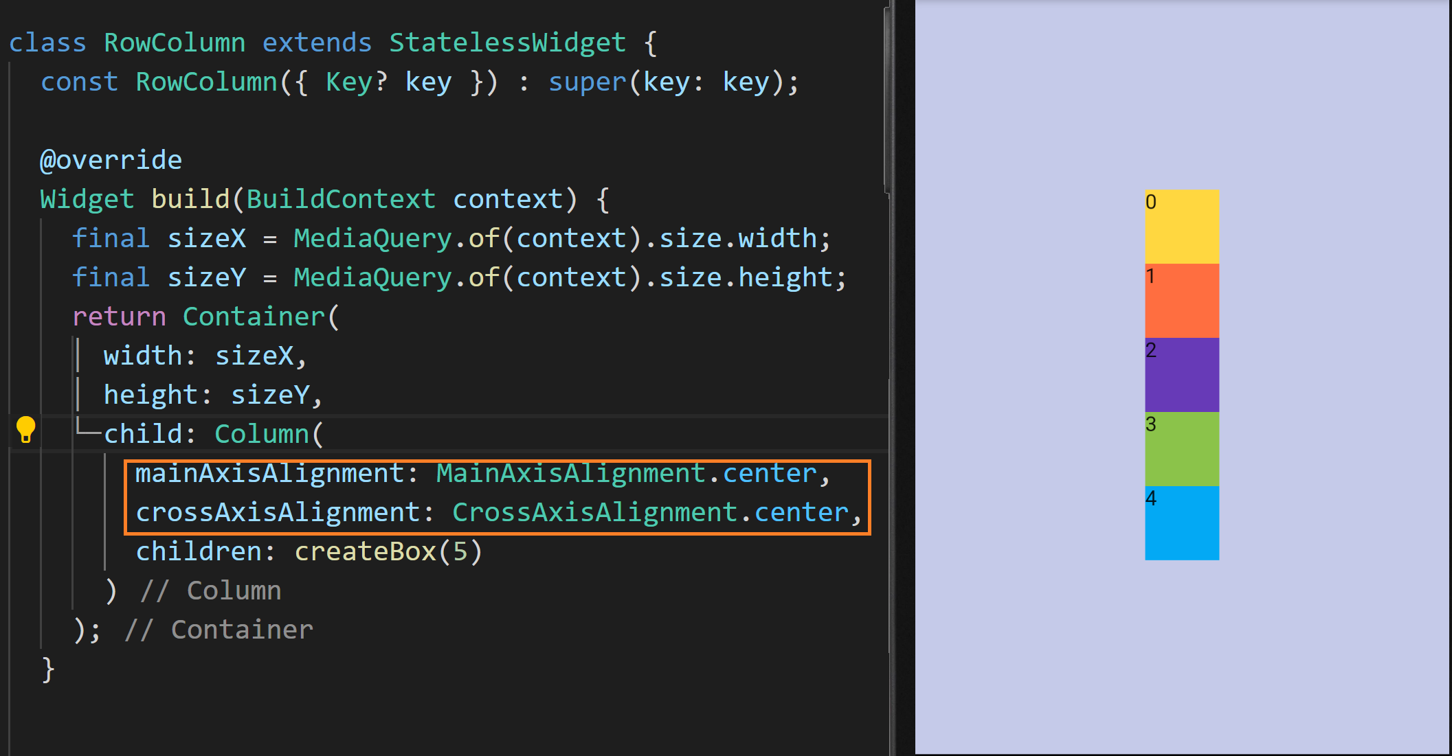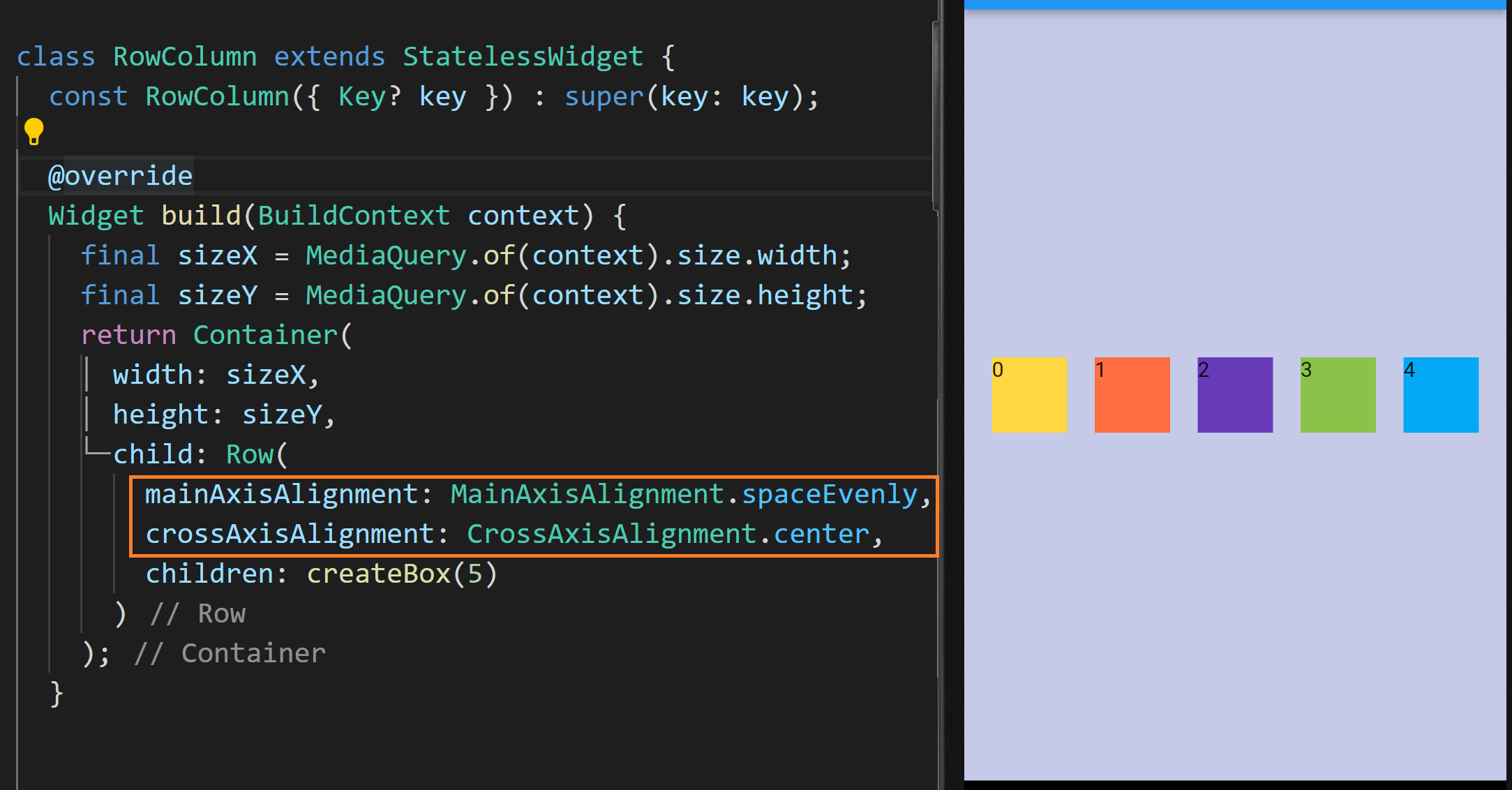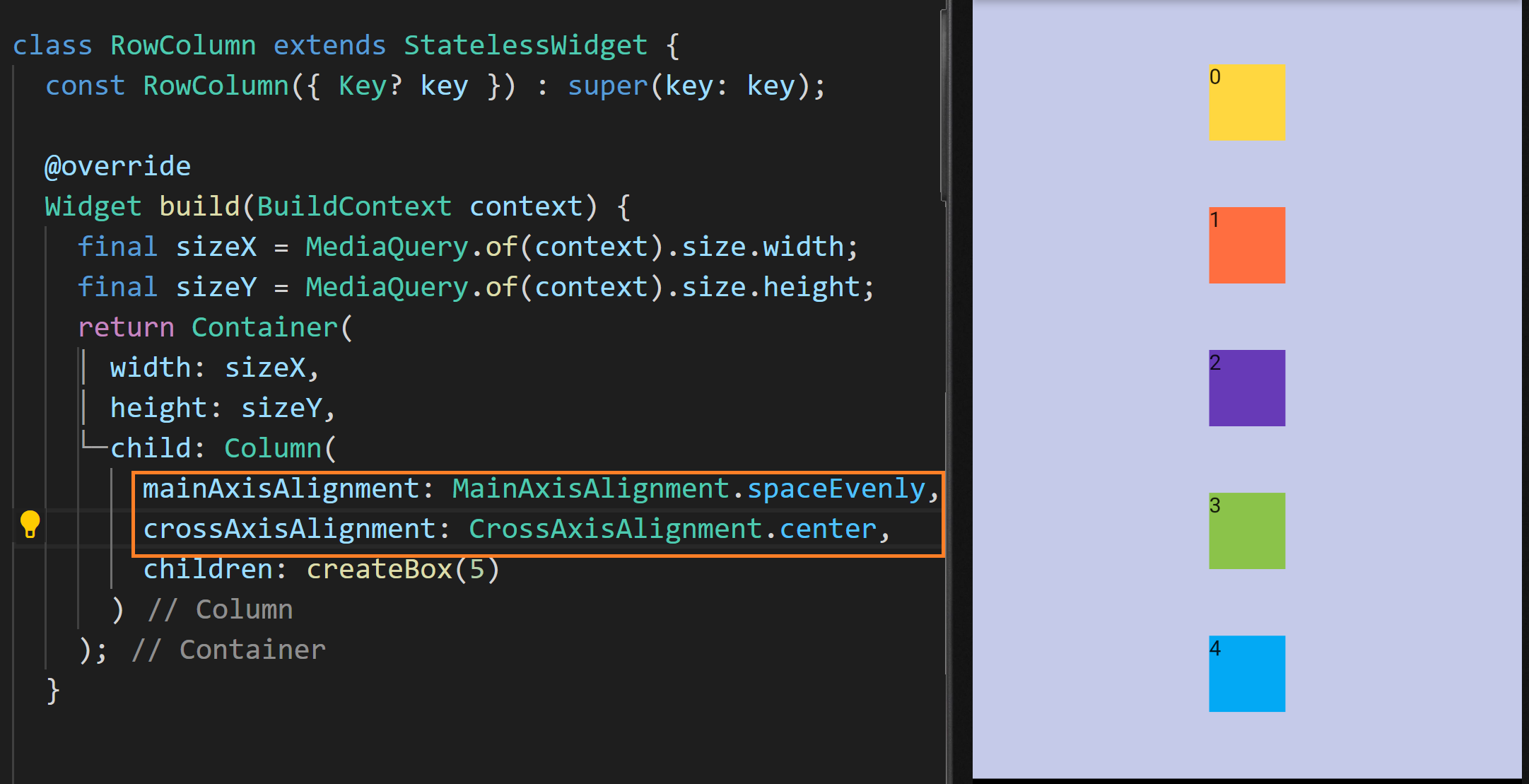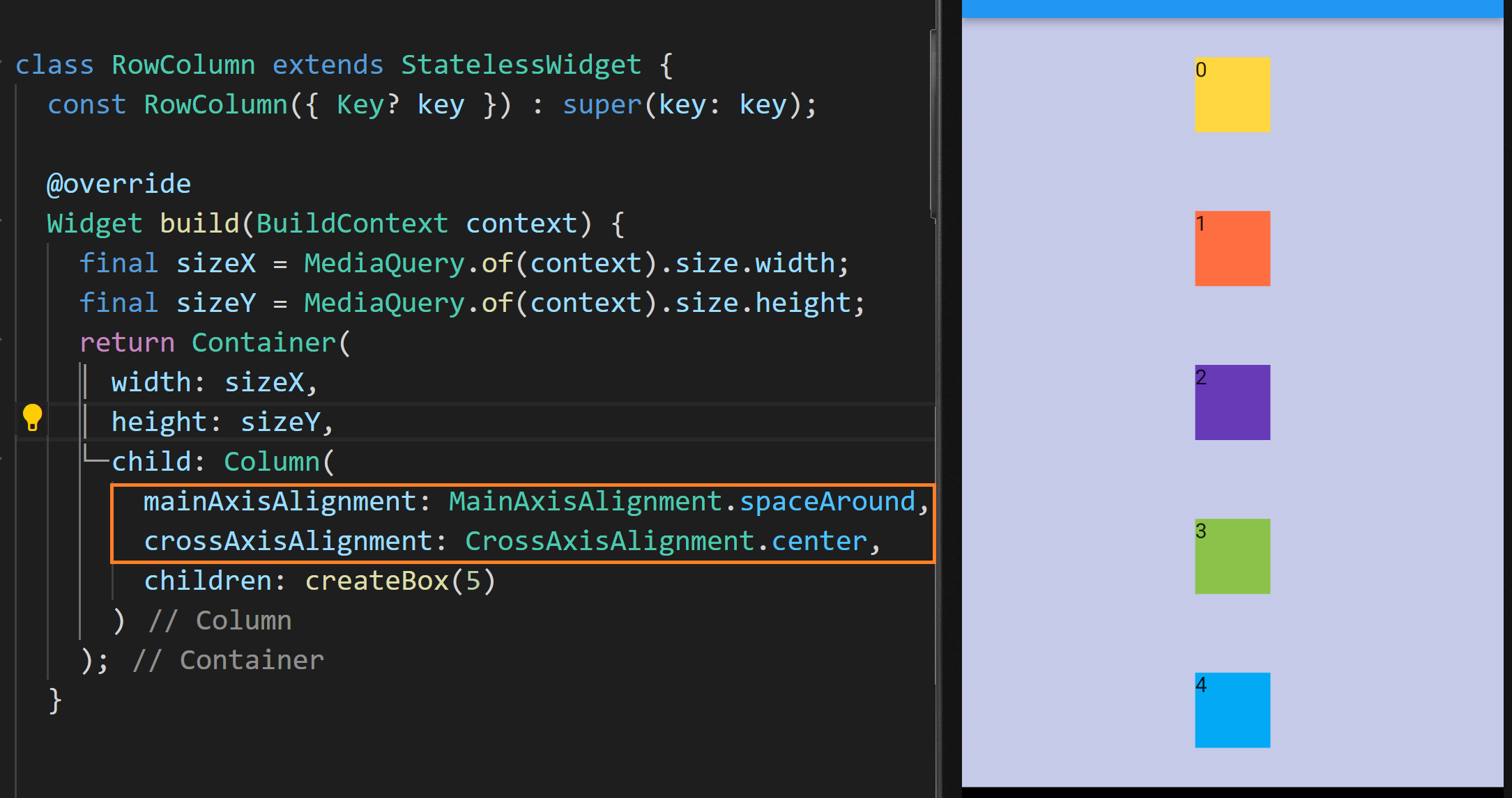 현재 컨테이너의 child는 Column으로 설정돼있고 그 안에 createBox가 호출되어 위젯 리스트가 설정되고 있습니다. 화면에 보다시피 사각형들이 화면 상단에서 열 방향으로 있습니다.