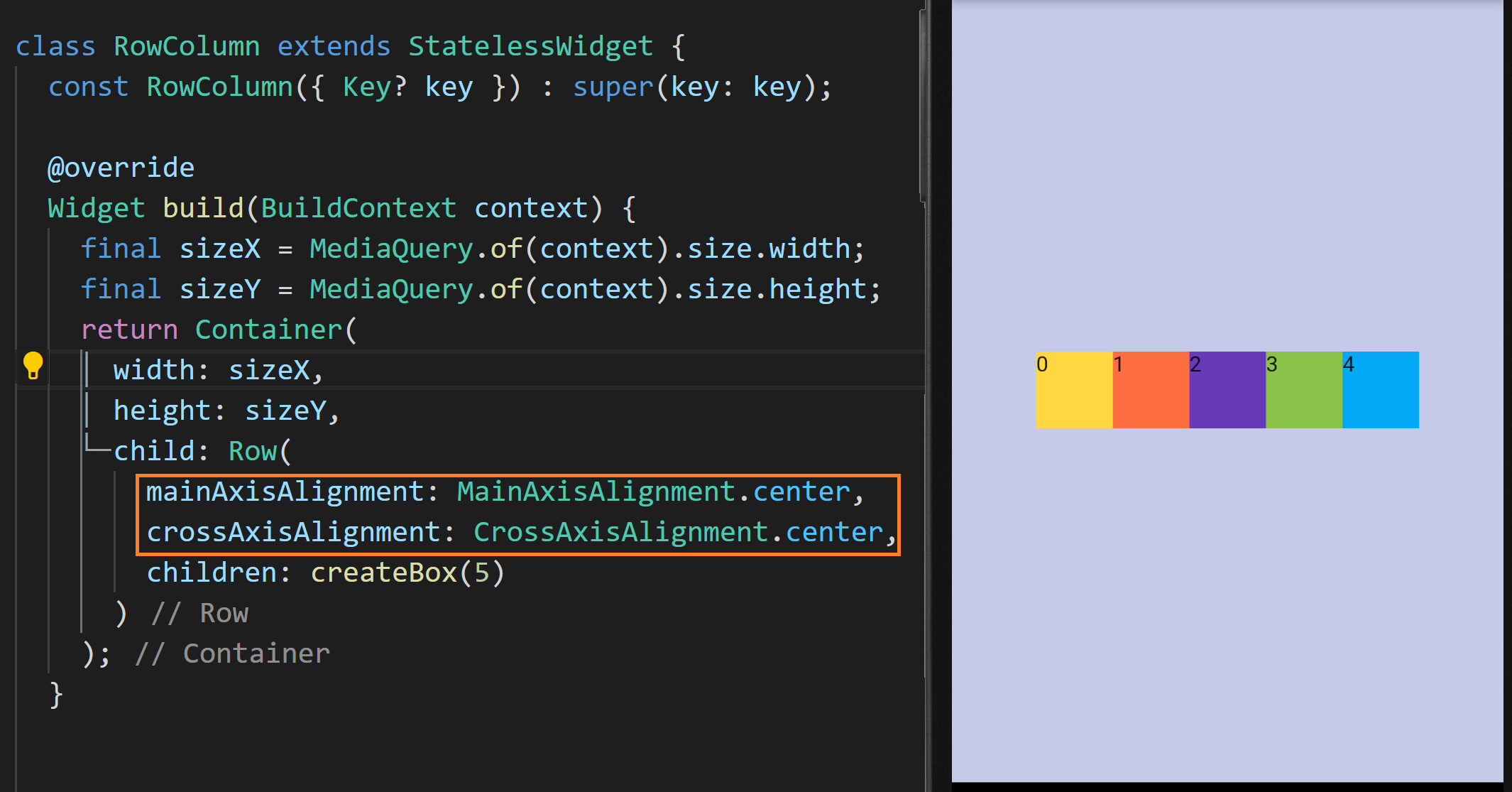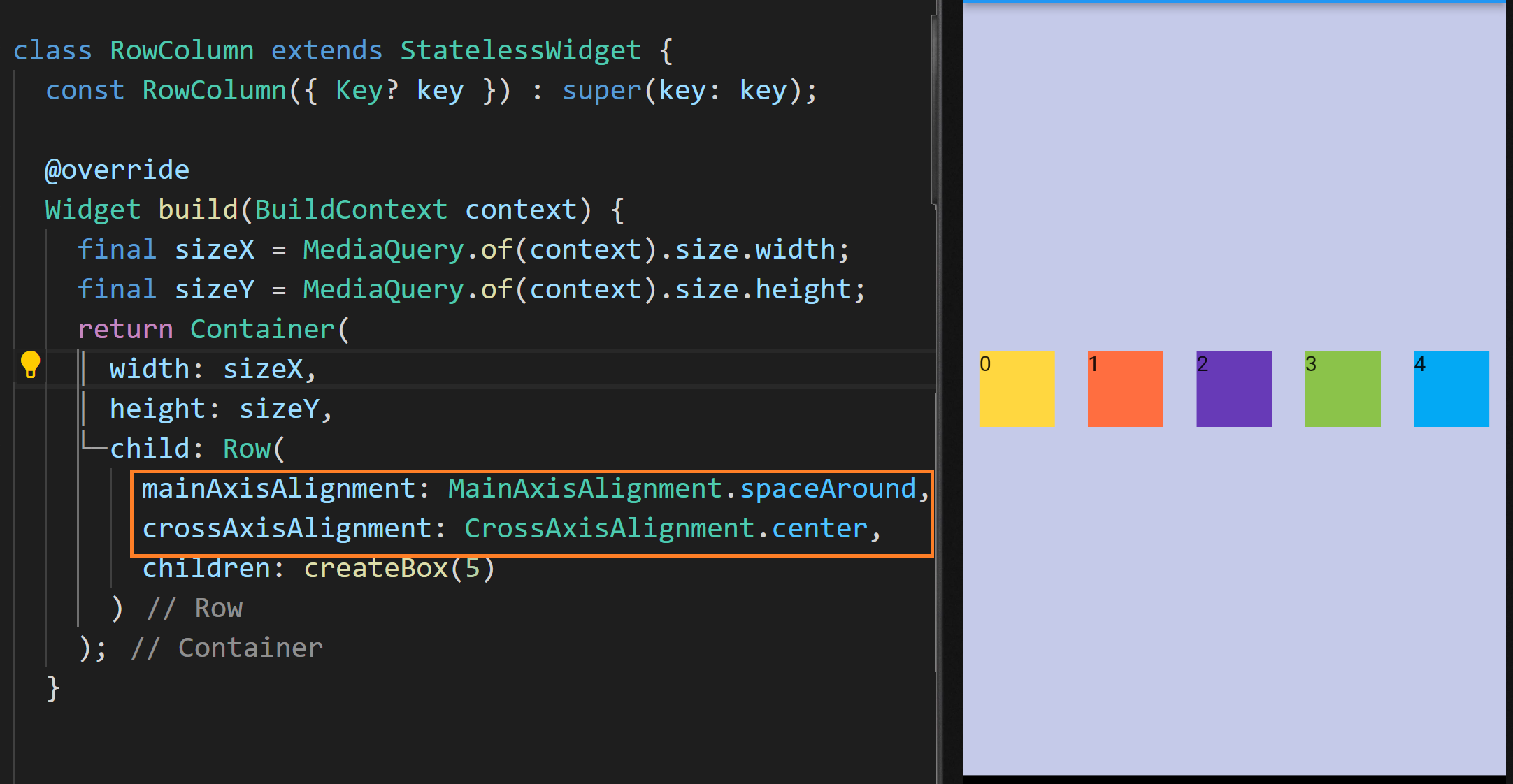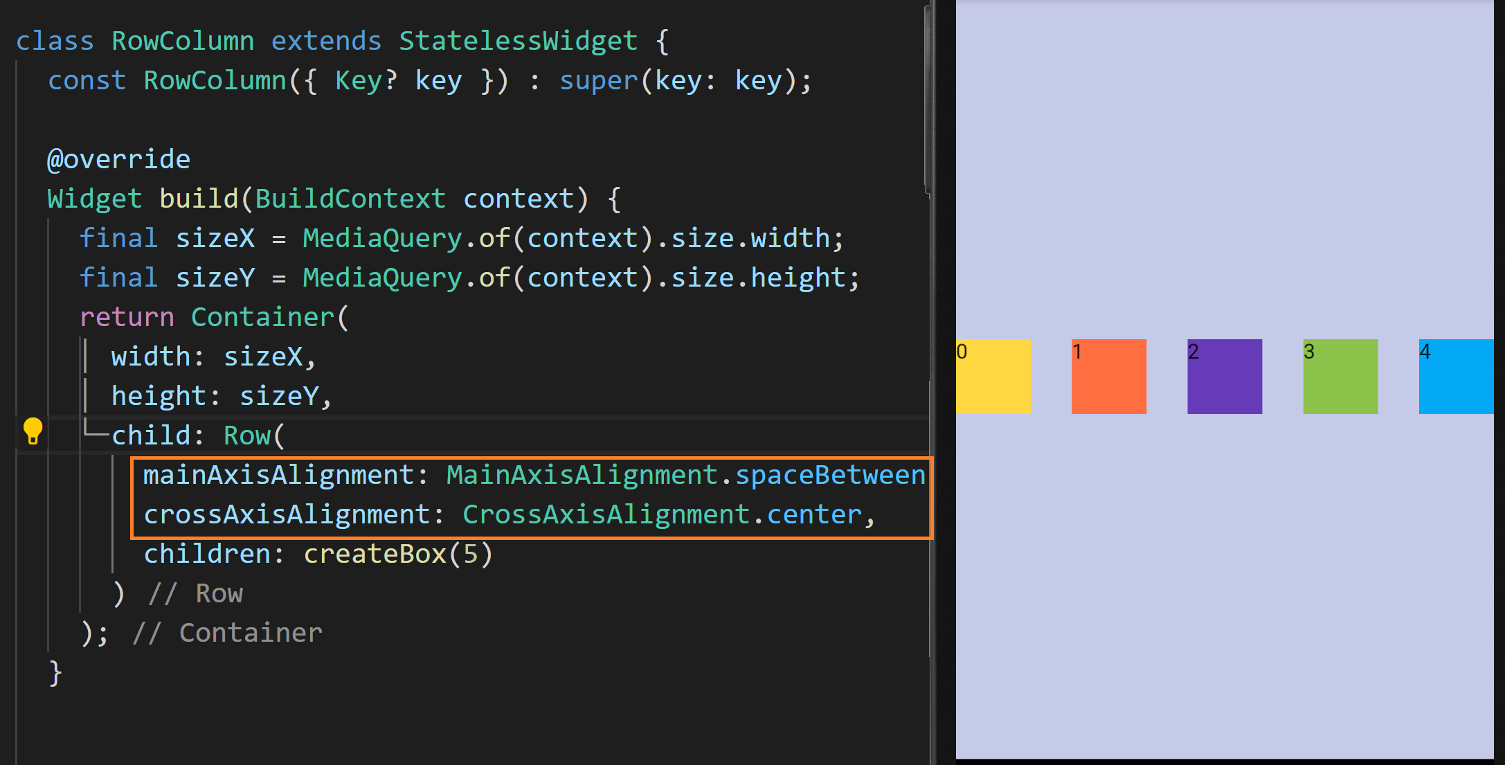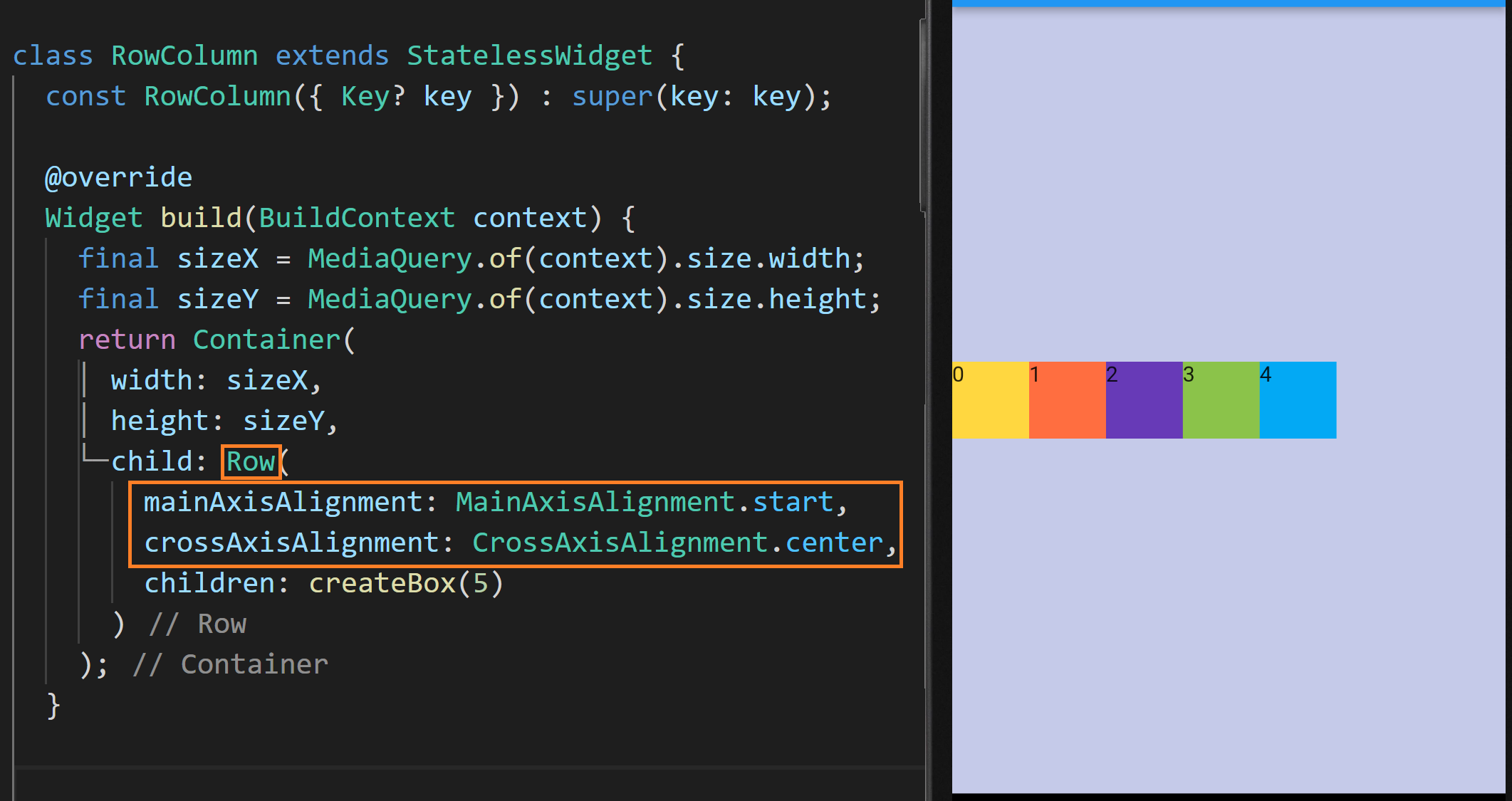 따라서 위 예제에서 상자들이 Row와 Column에 의해 정렬이 바뀐 이유를 생각해 볼 수 있는데요. Row와 Column의 기본값으로 MainAxisAlignment 값이 start, CrossAxisAlignment가 center로 설정되어 있기 때문입니다.