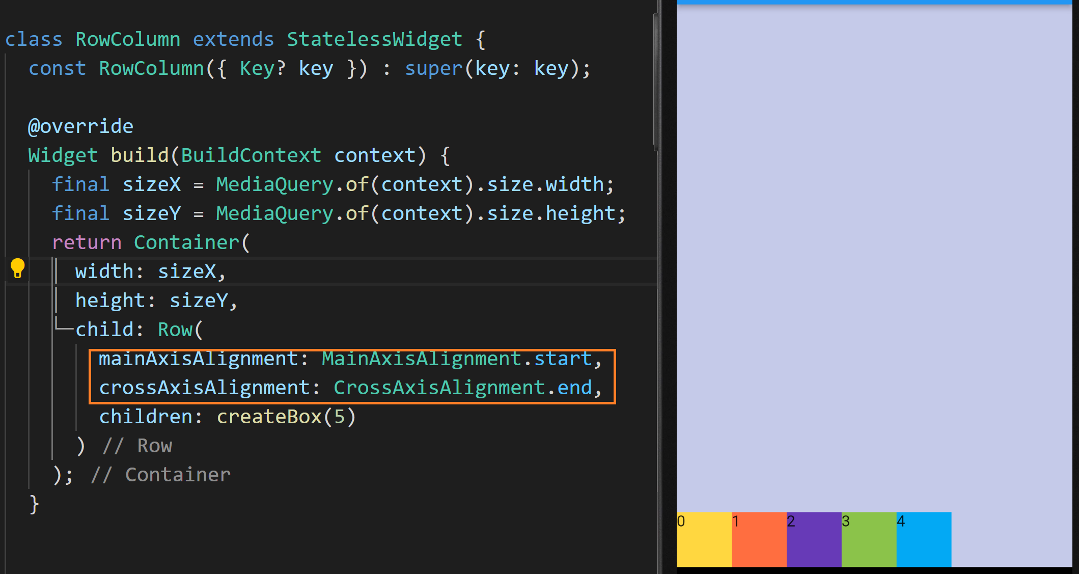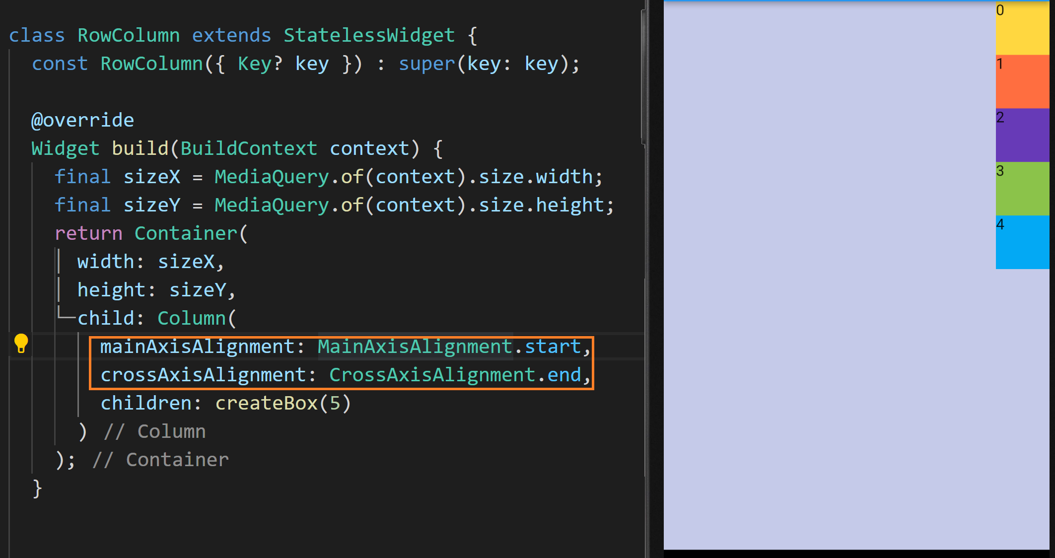 MainAxisAlignment.start, CrossAxisAlignment.end