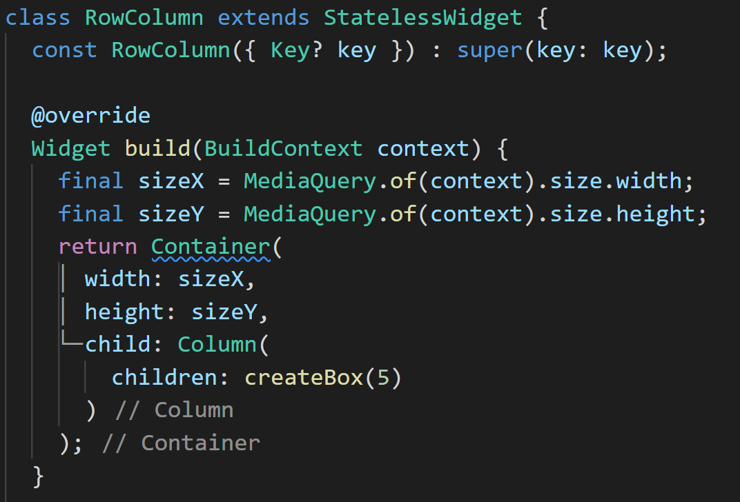 build 메소드에서 먼저 화면의 전체 너비를 가지는 sizeX라는 상수를 만들고 있습니다. 또한 화면의 전체 높이를 사용할 sizeY도 만들었습니다. 이렇게 만들어 줌으로 화면 전체공간을 확보할 수 있습니다. build 메소드에서 리턴되는 Container 위젯을 만들 때 width와 height로 sizeX와 sizeY를 사용하고 있습니다. 그리고 child에 오늘의 메인 주제인 Column 위젯을 설정하였고, children 속성에 createBox를 설정해 주었습니다.