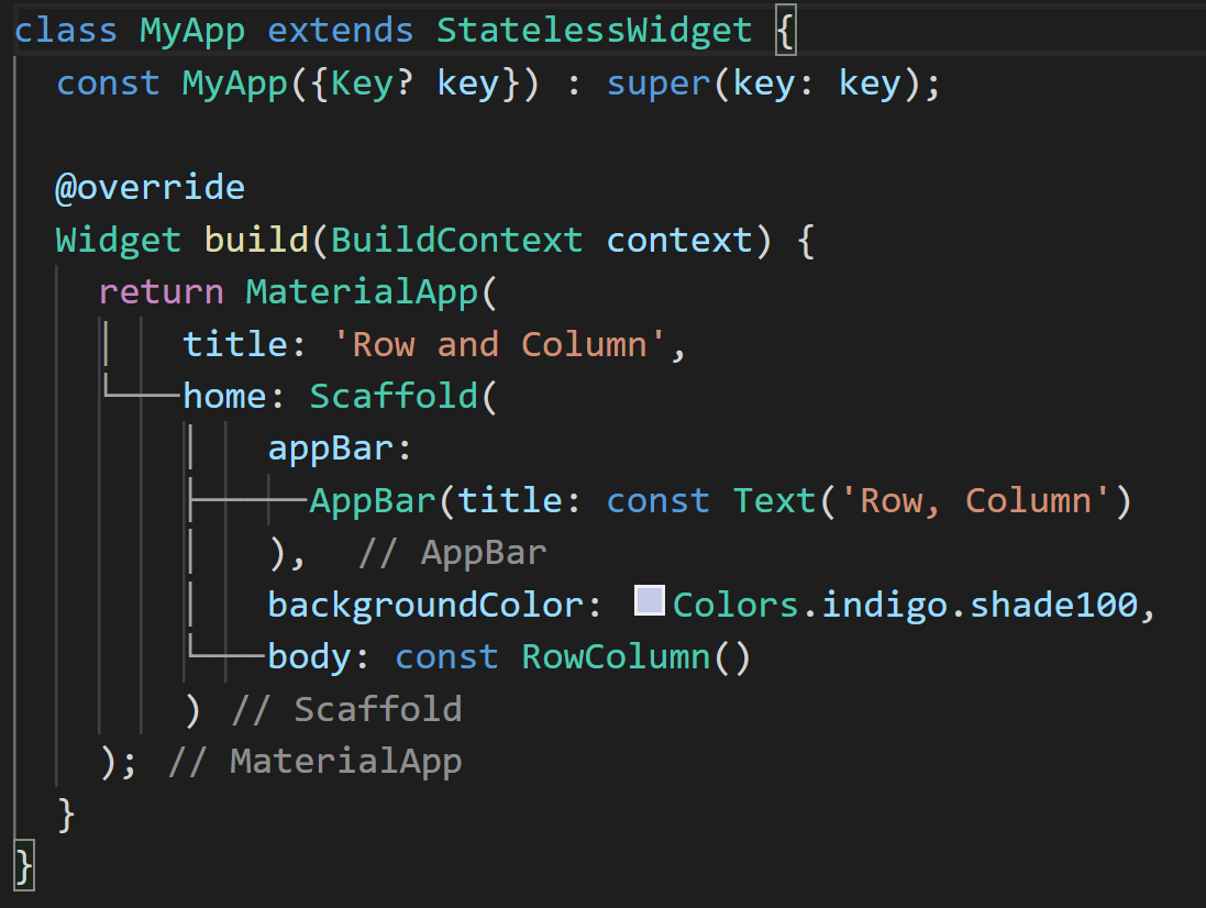 Row와 Column 실습을 위해 아래와 같은 코드를 작성하였습니다. MyApp 클래스는 StatelessWidget이며 body에 RowColumn 위젯을 설정하고 있습니다.