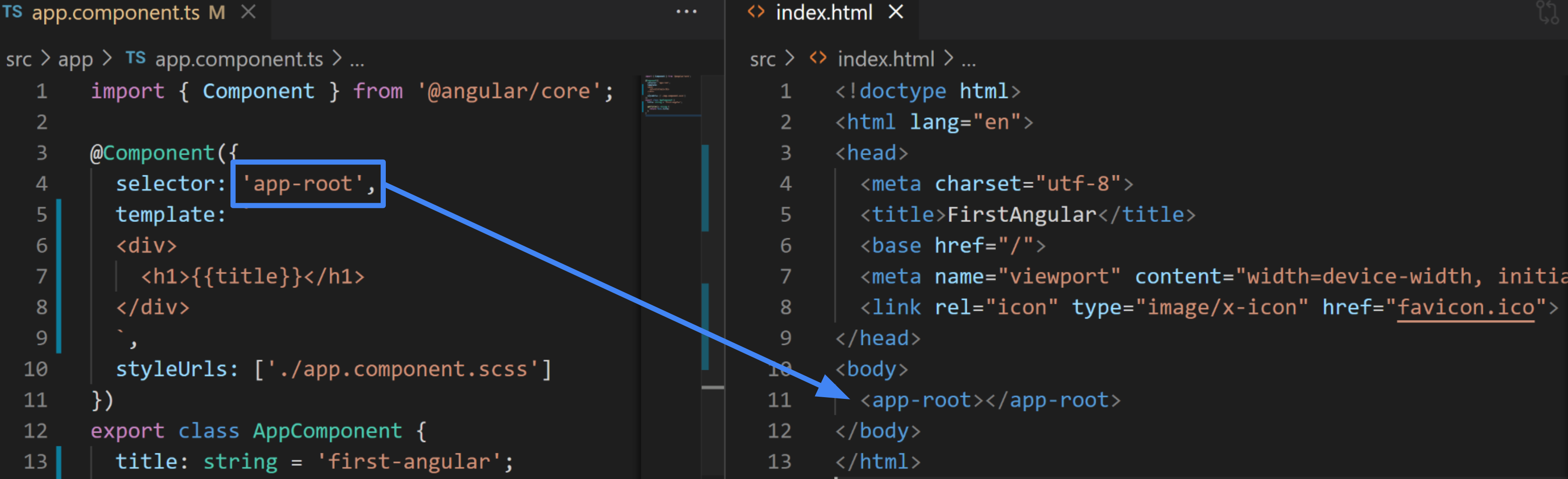 디렉티브의 로드가 완료되면 컴포넌트의 템플릿에 정의된 html이 selector element tag (예제 코드의 <app-root></app-root>)사이에 삽입되어 페이지에 나타납니다.